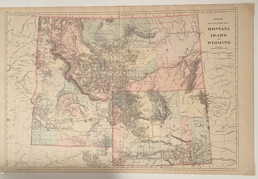 An attractive, very detailed, hand-colored map. 21.25" x 14.5." Scale 42 miles = 1." Also shows bordering portions of British Possessions, Washington, Oregon, Nevada, Utah, Colorado, Nebraska, and Dakota Territory. Hand-colored to show boundaries for counties and townships in Montana, Idaho, and Wyoming. All natural features are identified: lakes, rivers, creeks, rapids, springs, wells, mountains, hills, buttes, mountain passes, etc. Cities, towns, mines, missions, agencies, battlegrounds, and numerous military forts are shown. Several railroads are identified including: the Northern Pacific Railroad, Union Pacific Railroad, Central Pacific Railroad, Oregon Short Line Railroad, and Utah & Northern Division of the Union Pacific Railroad. State roads and travel routes are shown. Numerous Indian reservations are shown: Wind River Shoshone Indian Reservation; Kootnai Indian Reservation; Flathead Indian Reservation; Crow Indian Reservation; Nez Perces Indian Reservation; Gros Ventres, Piegan, Blood, Blackfeet, and River Crow Indian Reservations; and Arickarees, Gros Ventre, and Mandan Indian reservation. A fine, bright copy.