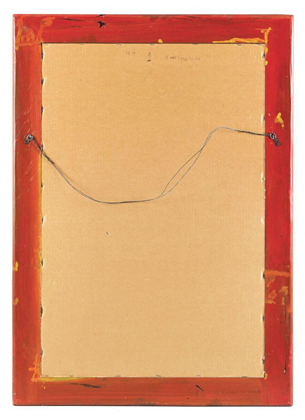 Colorful 36" x 24" of a pair of cowboy chaps. Framed in wood 42 1/2" x 30 1/2" that is decorated with quarters and an overall distressed look which are signatures of the long time noted Santa Fe artist. Attractive and in fine condition. "David Leigh “L.D.” Burke — designer, architect, poet, composer and magnificent free spirit — has died here at the age of 80. The designer of Cowboy Furniture of Santa Fe fell from a ladder on July 27 at his Heron Lake cabin and died at home in Santa Fe on July 30 of his injuries. A lifelong artist and designer, L.D. Burke spent part of his career in Chicago, living in the Riverwoods, Ill., area, and also in San Francisco. He held a fine arts degree from Colby College in Maine and was born in Norwood, Mass., where he grew up. He worked in and visited Texas where he fell in love with the West and cowboys before coming to Santa Fe in the early 1980’s and establishing his highly successful Cowboy Furniture of Santa Fe. Burke also designed several buildings in Santa Fe, including the Pink Church building on Pacheco Street, for use as his artistic base; also The Nunnery, Fortaleza Coyote on Second Street, the twin towers buildings at Jackalope Pottery, and the tall red, tan and chocolate brown and blue Granaries buildings at the corner of Sixth and Hopewell Streets, and his own home on Don Gaspar." .... Santa Fe newspaper.
