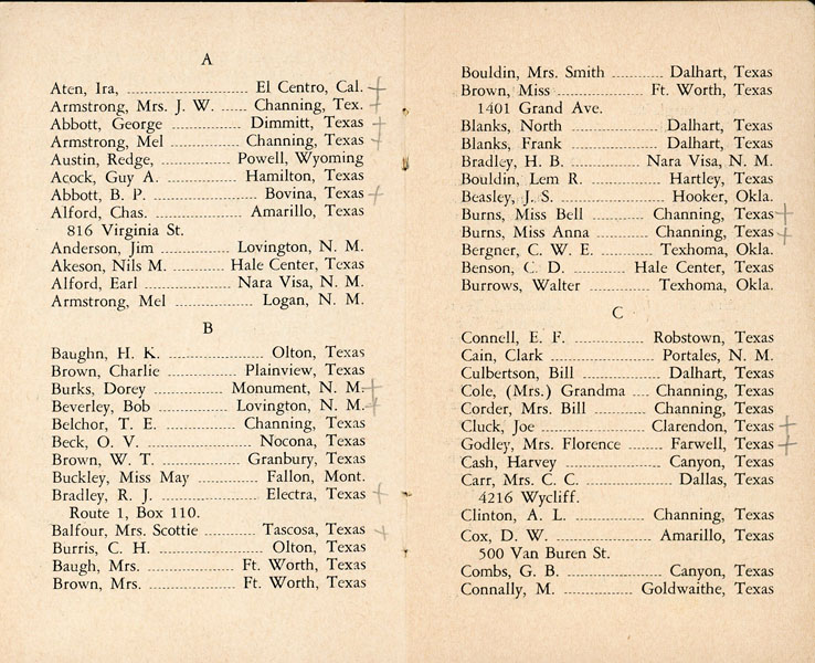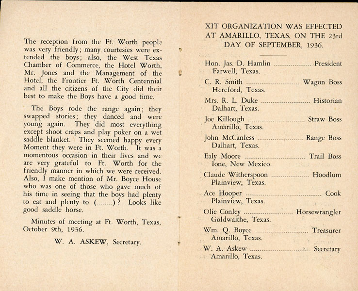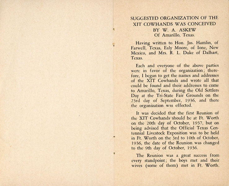 First Edition. 5 1/4" x 3 1/4" Pictorial Wrappers, n. p. (14 pp.). An informative privately printed booklet with an introduction titled SUGGESTED ORGANIZATION OF THE XIT COWHANDS WAS CONCEIVED BY W.A. Askew of Amarillo, Texas. The booklet lists 258 former cowhands who worked on the XIT along with their cities of residence. The majority of the cowboys are from Texas with others being from Minnesota, California, Montana, Wyoming, Missouri, Oklahoma, New York, Nebraska, Arizona and Illinois. Of the 258 cowhands listed are 26 women (wives of former cowhands). The first reunion of the XIT cowhands was held on October 9, 1936, in Fort Worth, Texas. The city of Fort Worth and its citizens were very welcoming to the cowhands and extended many courtesies to the cowboys. The cowhands had a good time as they swapped stories, renewed acquaintances, attended a dance, and had a brief opportunity to be young again. The XIT organization was effected at Amarillo, Texas on the 23rd day of September, 1936, with a slate of eleven board names. The board members are listed along with their addresses and board responsibilities. A few penciled manuscript marks are made in the margin, else a very good copy of a scarce item. Not in Adams Herd with OCLC listing two holdings.