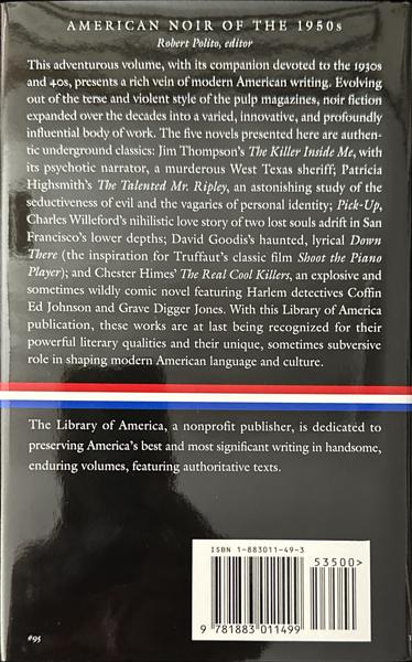 First edition. Fine in dust jacket. Contains The Postman Always Rings Twice, by James M. Cain, They Shoot Horses, Don't They? by Horace McCoy, Thieves Like Us by Edward Anderson, The Big Clock by Kenneth Fearing, Nightware Alley by William Lindsay Gresham, and I Married A Dead Man, by Cornell Woolrich. Together with: POLITO, ROBERT [SELECTED THE CONTENTS]. CRIME NOVELS. AMERICAN NOIR OF THE 1950S. [New York]: The Library of America, [1997]. First edition. Fine in dust jacket. Contains The Killer Inside Me by Jim Thompson, The Talented Mr. Ripley by Patricia Highsmith, Pick-Up by Charles Willeford, Down There by David Goodis, and The Real Cool Killers by Chester Himes. Two adventurous volumes by The Library of America to provide a rich vein of modern American writing too often neglected in mainstream literary histories. The volumes contain newly researched biographies and notes, and an essay on textual selection. All stories are fine examples of hard-boiled crime fiction.
