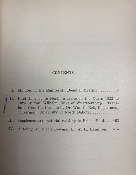 Story appears in South Dakota Historical Collections, Vol. XIX, 1938. Green cloth, 638 pp. in total. Story appears on page 475 to page 637, (162 pp.). A story of leaving West Virginia in 1884 and going on to South Dakota to become a cowman until he sold out and left the state in 1901. Hamilton provides observations about ranching, stock handling, hunting, weather, soil, wildlife, and the landscape. An interesting story that reads well. Also contained in this volume is "First Journey to North America in the Years 1822 to 1824 by Paul Wilhelm, Duke of Wuerttemberg." Story is translated from the German. Front free fly leaf missing and front spine loose else a good copy.