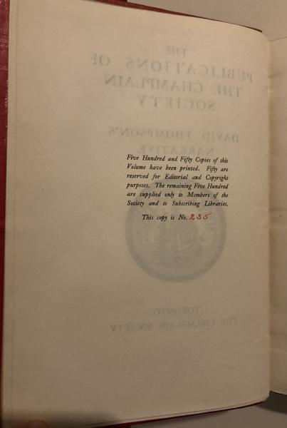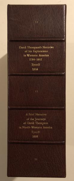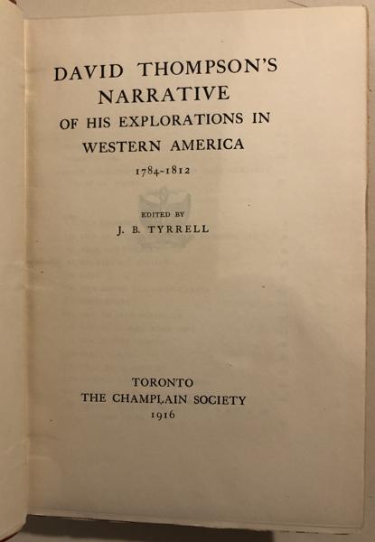 First Edition. Original Red Cloth, with gilt-imprint on spine. TEG. #235 of a Numbered Edition limited to 500 copies, less than 400 of which reached private hands. xcviii, 582pp.+viii List of Members and Subscribing Libraries. Three fold-out color plates depicting Thompson's sketches of mountain ranges in Montana and British Columbia, plus 18 additional Plates. 5 Maps, 4 of which are large folding maps in pocket-at-rear, as issued. Preface. Introduction. "David Thompson's Itinerary in North-Western America, 1785-1812". Bibliography. Index. An Englishman, David Thompson came to Ft. Churchill on Hudson's Bay in 1784, at the age of 14. Employed by the Hudson's Bay Company as a trapper and trader, Thompson was as much interested in mapping and exploration as he was in fur trading. He became a wilderness man, exploring and trading throughout the Canadian West and the northwestern part of what is now the United States. He learned surveying and explored and opened routes between Canadian posts. In 1797, Thompson joined the North West Company, conducting a major mapping tour west of Lake Superior. He traveled throughout northern Minnesota, the Red River region, and what later became Dakota Territory, visiting the Mandan Villages in January, 1798. In 1807, he crossed the Rocky Mountains and built the first trading post on the Upper Columbia. Thompson thoroughly explored the Columbia River basin over the course of the next 4 years. He gave the name, via his French Canadians, to the Nez Perces, introduced firearms among the various tribes, and was very active for several seasons as trader, as well as explorer. In his continuing efforts to establish trade and locate new fur country, Thompson reached the mouth of the Columbia in July, 1811, where he found the Astorians in the process of constructing their post. He returned to Montreal in 1813, and one year later produced a map of truly exceptional importance. Of Thompson, the outstanding scholar, Elliott Coues wrote in 1897, "(He) explored and charted an important and previously unknown region. Thompson was the first white man to follow the Columbia from its source to its mouth. He mapped with sextant and compass, traveling fifty thousand miles on foot, horseback, and canoe. The Indians called him Koo-Koo-Sint (man who looks at the stars)..."The greatest geographer of his day in British America, and maker of what was then by far its greatest map." In his monumental work, Mapping The Transmississippi West, Carl Wheat wrote of Thompson and his maps, "As cartographer and explorer he was second to no man of his period..."One of the greatest maps ever drawn, a magnificent cartographic monument to its maker." A manuscript copy of Thompson's early map of the Upper Missouri was found among William Clark's papers in the Library of Congress on the back of which is written, "This Belongs to Capt. Lewis". The maps value to Lewis and Clark was that it was the first map to accurately locate the Mandan and Arikara villages. The narrative of David Thompson's exploration and his great maps are produced here in one massive volume. This important first edition is the most highly sought publication of The Champlain Society. Thompson's narrative is brilliantly edited by Joseph B. Tyrrell, with the resultant work being of great importance, complete with maps and plates illustrating Thompson's exploration. Of this work, Wright Howes states, "Most important contribution to western history and exploration published in the twentieth century, Thompson's operations on the Upper Columbia and Spokane rivers, in 1807, gave color to England's Oregon claims." Slight sunning to spine, else an exceptionally clean, tight, bright, fine, uncut copy of this rare and important work. Color fold-out plates and maps in fine, bright condition. Protected in a Half-Leather, Clamshell case, with title, author, and year of publication in gilt on spine. Avidly-sought and rarely-offered, this important work is a cornerstone for any collection of early Western exploration and cartography. Also included is Joseph Tyrrell's rare, earlier work, A BRIEF NARRATIVE OF THE JOURNEYS OF DAVID THOMPSON, IN NORTH-WESTERN AMERICA. Printed by The Copp, Clark Company, Limited, General Printers of Toronto, in 1888. 28pp. in Printed Wrappers. A little-known, early, and scholarly account by Tyrrell of Thompson's great manuscript journals. The main body of this work is a precise itinerary and chronologically followed movements of Thompson throughout the western country. Appended is a five page table locating 83 forts and trading posts which Thompson visited and described. A very good copy of this rare and fragile work. A Presentation Copy: "With the Author's Compliments" in ink along top edge of front wrapper. Both rarities housed in the same Clamshell case.