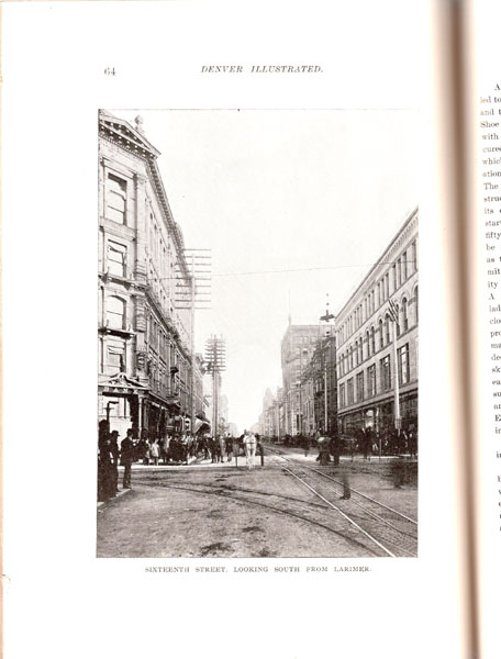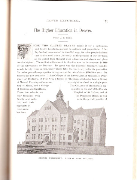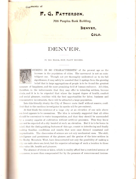 First edition. 8vo. Original color decorated wrappers, ix, [10] -88, xi-xvii [1] pp., illustrations from photographs, frontispiece [portrait], advertisements, plus two inserted slips. An illustrated pictorial tour and history of Denver, designed to entice settlers to the city. Indeed, this volume was issued under the auspices of the Denver Real Estate and Stock Exchange, and the two inserted slips are from realty and mortgage agents, as are many of the advertisements. The text includes a history of Denver by Mayor Platt Rogers, as well as articles on real estate, schools, hospitals, and manufactures. The photographically-derived illustrations include a panoramic view of the city, noteworthy public buildings, attractive homes, hotels, theatres, churches, the Chamberlin Observatory, and the "Columbine School." OCLC locates a total of ten copies. Covers lightly soiled, separation along the front hinge at the spine ends, interior clean, else a very good copy. Scarce.