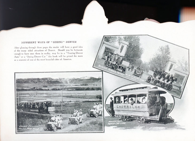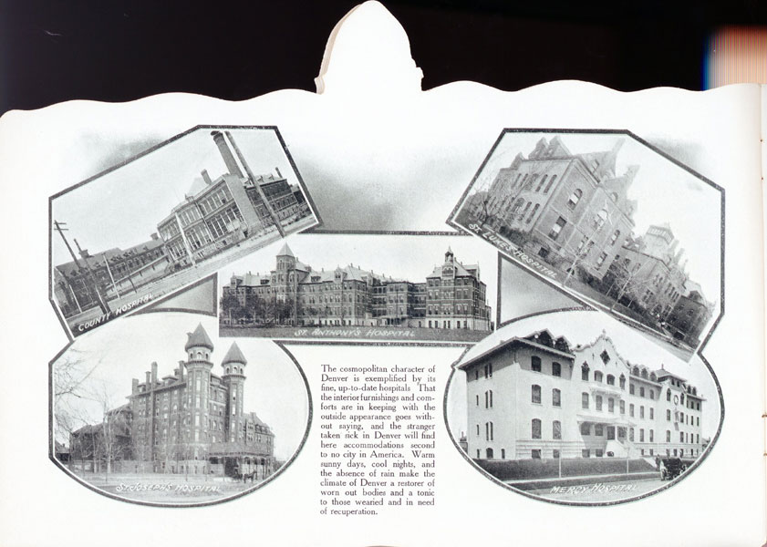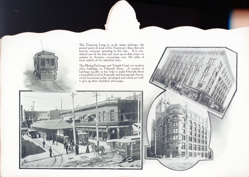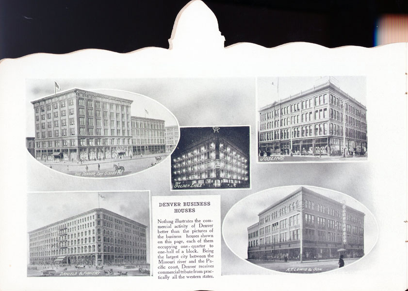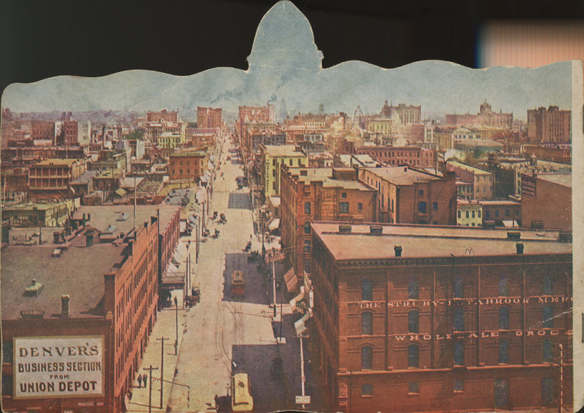 Approximately 5 1/5" x 9" with dome of state capitol rising another inch at center of booklet, in color pictorial wrappers depicting the capitol building and its grounds on the front cover and depicting Denver's business section on the rear cover. 32 pp., illustrations. "A descriptive view book telling by pen and camera the story of Denver - the metropolis of the West-springing up as if by magic where, less than fifty years ago, roamed vast herds of buffalo and antelope, disturbed only by the red man and the prairie wolf." Offers the history of Denver as well as information on and numerous pictures of various scenes in Denver to include the Union Depot, its county buildings, its business and residence streets, various business buildings, theaters, hotels, clubs, its architecture, churches, schools, parks, etc. A two-page scene of the city of Denver at center. Light crease to front cover corner, else a very good copy of a nicely produced Denver item.