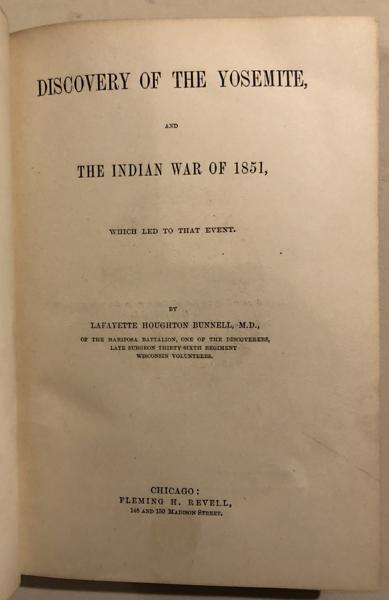 First Edition. First State. Tan cloth. 331pp. Frontispiece, with Map and 19 additional illustrations. Introduction. "Dr. Bunnell, of the Mariposa Battalion, was one of the discoverers. The expedition was conducted against the Mariposa Indians." Cowan p.29. His companion on the trip was Colonel Henderson, who afterwards became famous as the capturer of Joaquin Murieta, "Three-fingered Jack", and several other California outlaws. A detailed account of the Indian campaign and the resultant discovery of what became Yosemite National Park. General modest edge wear and soiling, with heavier wear to spine ends and corners. Otherwise an uncommonly clean, tight copy of this very scarce work. Good-Very Good.