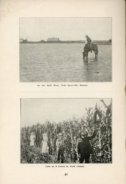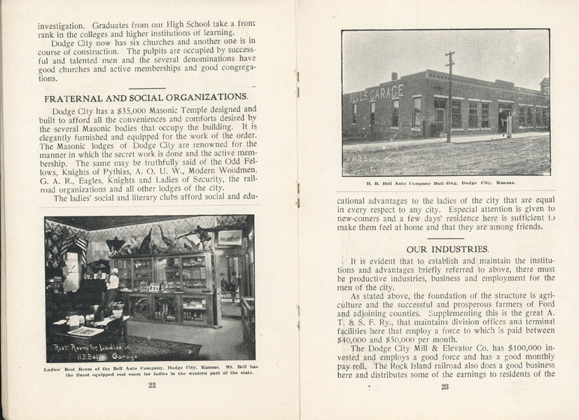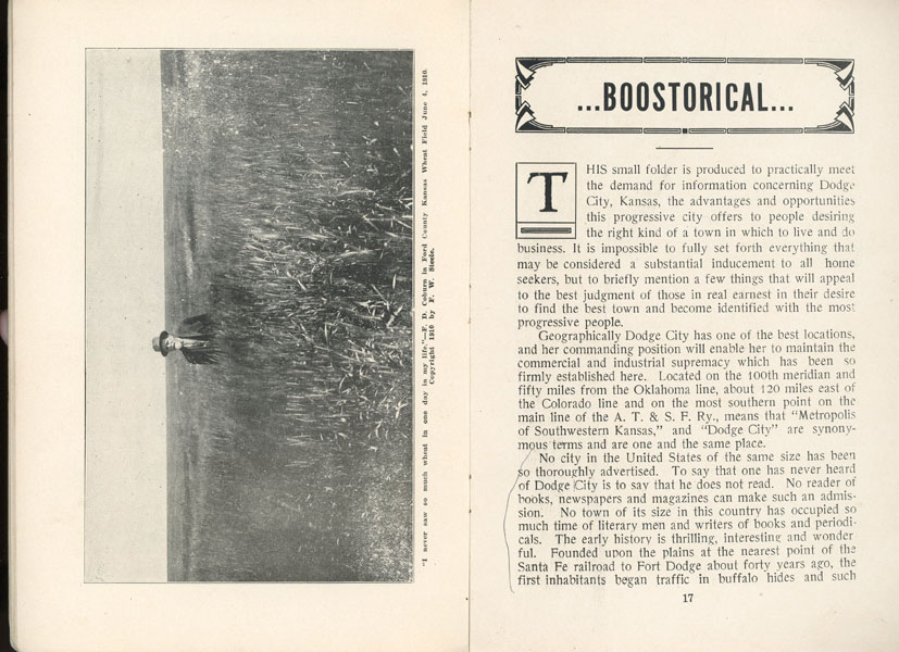 First edition. 8vo. Original color-printed gray stapled wrappers with title printed in blue and orange on the front cover, 40 pp., frontispiece [photograph of the Famous Dodge City Cowboy Band], illustrated from photographs. Being a souvenir-type booklet with a photographic illustration on almost every page. Touching on many aspects of life in Dodge City, Kansas in the early 20th Century. There are a number of farming scenes along with a few businesses and private residences. There are two photographs specifically featuring people: “The Famous Dodge City Cowboy Band . . .” and “A Group of Indian Chiefs Captured After One of the Last of the Cattle Raids Near Dodge City, and one showing a reproduction of the lock with which Larry Digger imprisoned Bat Masterson, the Great "Newspaper Idol" of the early days in the great Southwest. The first part of the booklet is dedicated to the history of Dodge City and Ford County. The second part focuses on many aspects of life in Dodge City such as the climate, schools and churches, social organizations, industry and opportunity. A rare booklet, apparently unknown to Adams and other relevant bibliographies. Pages 19-22 detached from staples, faint vertical creases to the front cover, a tiny nick to the fore-edge of the front cover, else a very good copy with covers lightly used.