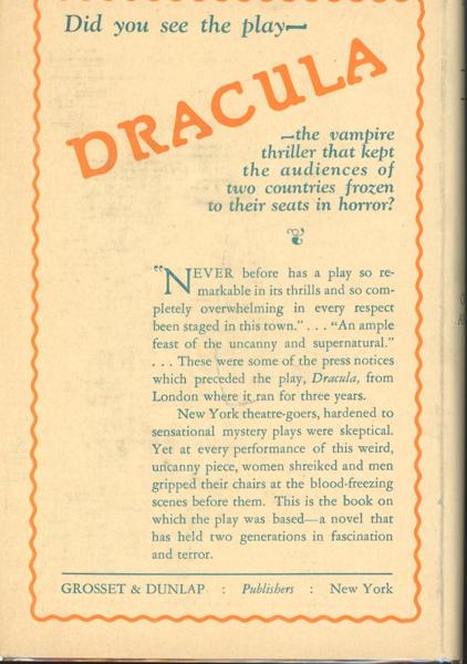 First edition thus. GROSSET EDITION. Original orange cloth with titles stamped in black on the front cover and spine, x, 354 pp., plus 2 pages of advertisements. A very good clean copy in a beautiful fine, fresh dust jacket. Tales of vampires have long haunted folklore and literature, but none has had the impact of Bram Stoker's Dracula.