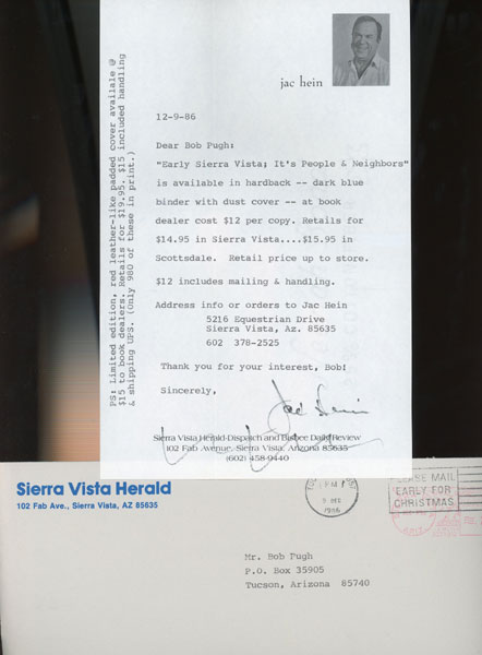 First edition. 8vo. Limited edition. Signed by the author on the front free fly leaf. Bright red leather-like padded material, titles and decorations stamped in gilt on the front cover and spine, yellow front and rear endpapers, [14], 282 pp.,dedication, prelude, forward, illustrated mostly from photographs, portraits, about the author. A privately printed history of Sierra Vista, Arizona which is located in Cochise County, Arizona. Includes material on the surrounding area's mining and ranching activities and material on Fort Huachuca. As new, unread copy without dust jacket, as issued. Laid-in to this copy is a typed letter dated 12-9-86 and signed by the author. In the letter he provides information about the book. Letter is housed in the original mailing envelope.