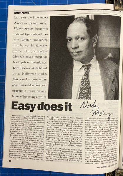 First edition. Signed by Walter Mosley. Pictorial color wrappers. Article appears in Bookseller magazine of July 16, 1993, a magazine dedicated to the book trade of England. A nice article about Mosley, Easy Rawlins, and President Clinton's announcement that Mosley was his favorite writer. From the library of noted collector Rolland Comstock. Fine.