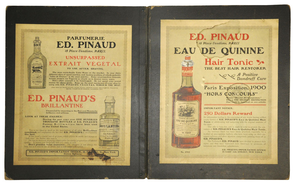 A fabulous advertising piece for Ed. Pinaud and his Parfumerie in Paris. It is a folded stiff card showing the 40 possibilities of moustache, beard and sideburn possibilities and assures the consumer that it "imparts to the hair and moustache softness and brilliancy. No gentleman's dressing table complete without it." Mr. Ed Pinaud placed above competition at the Paris Exposition of 1900. On one side are the 40 beard, mustache and sideburn profiles. When opened it measures 22 1/2" x 28 1/2" This side is near mint with only the slightest of stain. The obverse side is advertising Pinaud's other products, those being Eau De Quinine Hair Tonic - The best Hair Restorer. A Positive Dandruff Cure; Ed Pinaud - Unsurpassed Extract Vegetal to use after shaving and Ed. Pinaud's Brillantine - Unequaled for imparting to the Hair and Moustache brilliancy and softness. Several stains to this side, but overall in very good condition. The advertising piece was published by Palmer and Oliver of New York.
