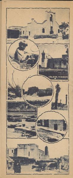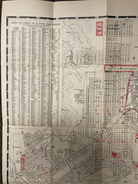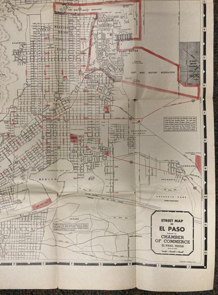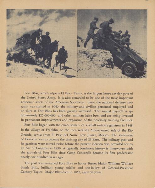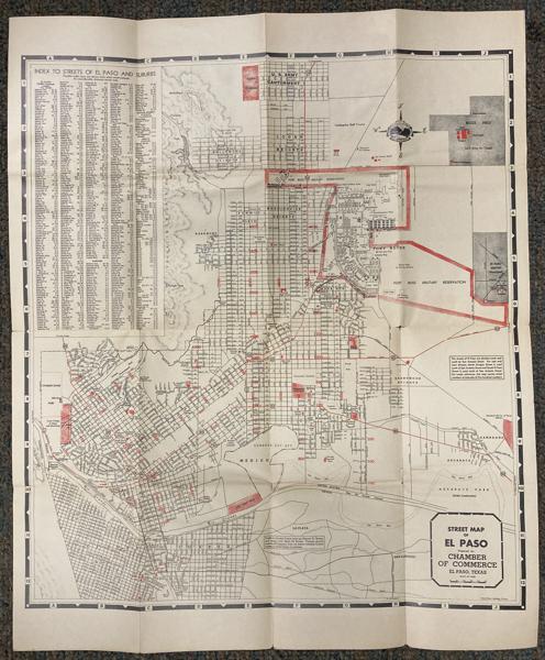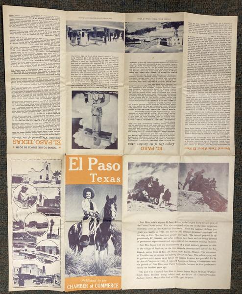 Unrecorded. 17" x 14" peach-colored sheet, folded to 16 panels. Printed in orange and blue. Two cover panels ... one showing a photograph of a cowgirl astride a horse and the other showing photographs of various points of interest. Remaining 6 panels offer information on Fort Bliss, general facts about El Paso to include industries, location, climate, etc. and with brief information on things to see and do in El Paso. Opposite panels offer a street map of El Paso and with an Index to streets at side of map. Horizontal fold to center of brochure and with light wear to the extremities. Very good.