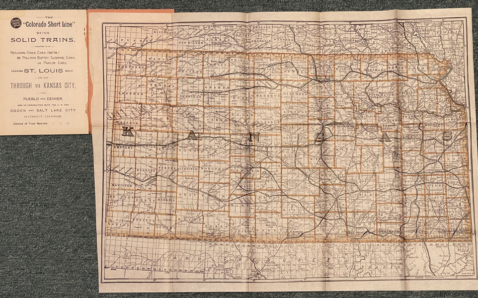 Third edition. 12mo. Original orange wrappers printed in black ink, 82 [2] pp., illustrated, map. advertising. Issued by the general passenger department of the Missouri Pacific Railway. A general description of the state and its place in history is provided. Plus soil, rainfall, churches, schools, higher educational opportunities, newspapers, population and wealth, corn, wheat, oats, stock farming, wild flowers, orchards and vineyards, salt, lead and zinc, stone, brick and lime, coal, gas, hunting and fishing, cities, irrigation, etc. Views are offered of farms and ranches, parade grounds, city parks, etc. of various cities. Herd 1204 says "Issued by the Missouri Pacific Railway Company, this book appeared in many editions, though all are now rare." Prior to this copy the earliest edition of a similar booklet was a 13th edition and that was 15 years ago. Fine, clean copy with a fine folding map. An exceptional copy of a rare item.
