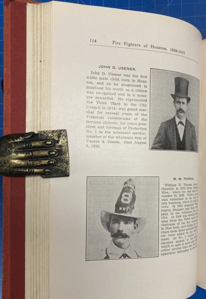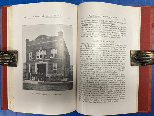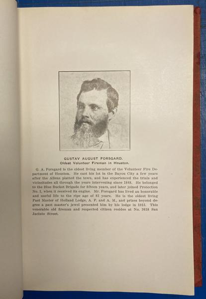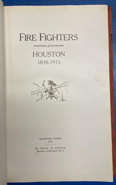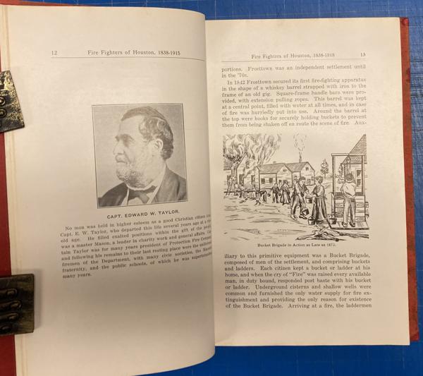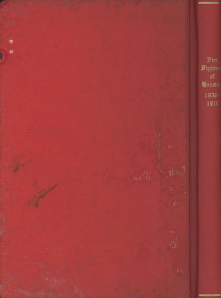 First edition. 8vo. Red cloth, bright red front and rear original endpapers, 187 pp., plus 4 pages of the index, introductory, illustrated mostly from photographs, portraits, index. Stories of Houston's Volunteer fire fighters and their careers, families and deaths. Many great photographs and illustrations. Rare account. Spine has been replaced with matching cloth, signatures have been rebound, cloth is moderately soiled, else a bright, tight and clean