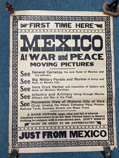 Broadside/Poster, 21" x 28", boldy printed in black on thin, tanned paper. Some rippling and creasing from poor storage, a few chips at margins and one corner, two small archival repairs to closed tears on verso, but overall still a very good example of this delicate item. A rare poster promoting a screening of early documentary film footage of the Mexican Revolution in progress. No filmmaker or production company is credited. The reference to "Mexico's new ruler, General Carranza" suggests a date of 1914, and indeed, we located a newspaper reference to a screening in Bakersfield, California in September of that year, as well as one in Tucson in 1915. American interest in the political upheavals of its southern neighbor was considerable. Although no battle footage is promised, recent moving pictures of warships in Vera Cruz harbor and soldiers moving artillery in the field would have offered a novel opportunity for Americans to go beyond the newspaper page to understand historic events as they unfolded. The Tucson showing of this film was even accompanied by a "free exhibit of saddles, rifles, and sombreros and relics from the battle field." Very good, bright broadside.