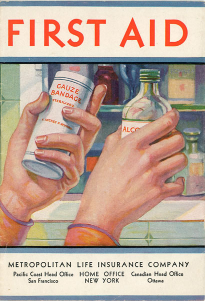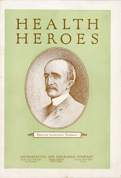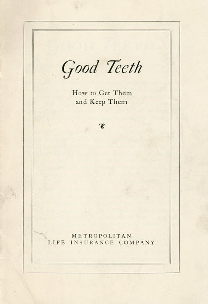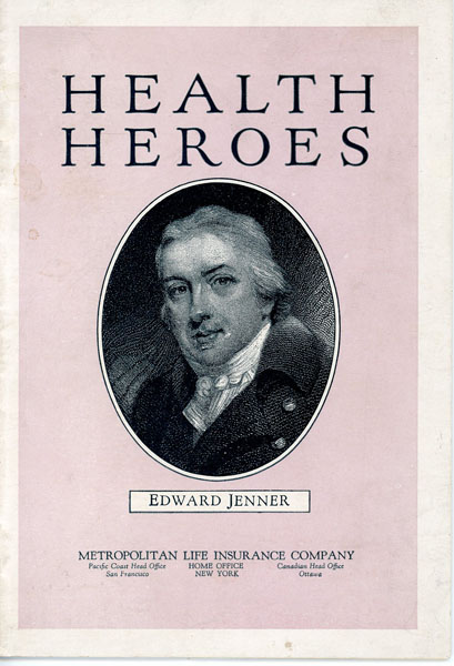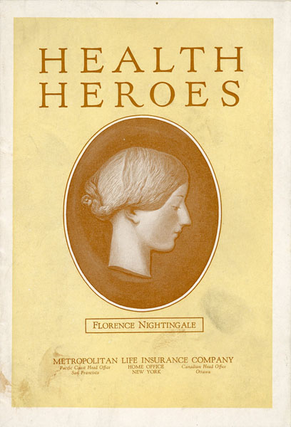 A collection of 5 pamphlets printed and distributed by the Metropolitan Life Insurance Company's sales staff to doctors upon whom the salesmen were calling. Each pamphlet offers a different subject. Three pamphlets entitled, "Health Heroes," each with 24pp., illustrations, and references. Health Heroes pamphlets include Florence Nightingale, Edward Jenner and Edward Livingston Trudeau, each offering the individual's life story. All three of the "Health Heroes" pamphlets are written by Grace T. Hallock and C.E. Turner. One pamphlet entitled, "First Aid." 24pp. Black and white illustrations. Index. Discusses treatment of wounds, asphyxiation, artificial respiration, electric shock, drowning, choking, poisons, effects of heat, fractures and dislocations, sprains, strains, home care of common ailments, what belongs in one's medicine chest, etc. One pamphlet entitled, "Good Teeth. How to Get Them and Keep Them." 16pp. Black and white illustrations. Discusses the tooth's structure, first aid for teeth, pain, fissures, how to keep one's teeth clean, how to use a toothbrush, lime water rinse, how teeth grown, crooked teeth, etc. All pamphlets lightly soiled and with minor wear and creasing. Good to very good.