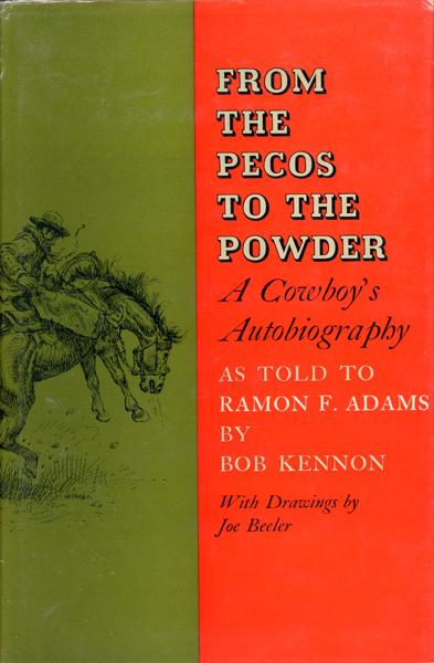 First edition. 8vo. Pictorial cloth, titles stamped in gilt on the spine, xi [blank], 251 pp., "preface" by Adams, illustrations with drawings by Joe Beeler and with photographs, dedicated to Charlie Russell et al, and with much on Russell in text. One of the more entertaining cowboy memoirs. Author recalls his boyhood in Texas (he knew the Ketchums, Kid Curry, Charles M. Russell, and Sheriff Rhome Shield of San Angelo). Kennon recounts his experiences driving cattle, breaking horses, and surviving the hazards of frontier life across Texas, New Mexico, Wyoming, and Montana. He tells about wandering from ranch to ranch in the southwest, his trek to Montana with a trail herd, and his life thereafter among the people and ranches of the area. Near fine copy in price-clipped dust jacket with light wear to the spine ends and corners.
