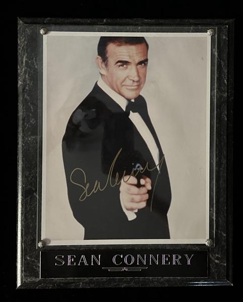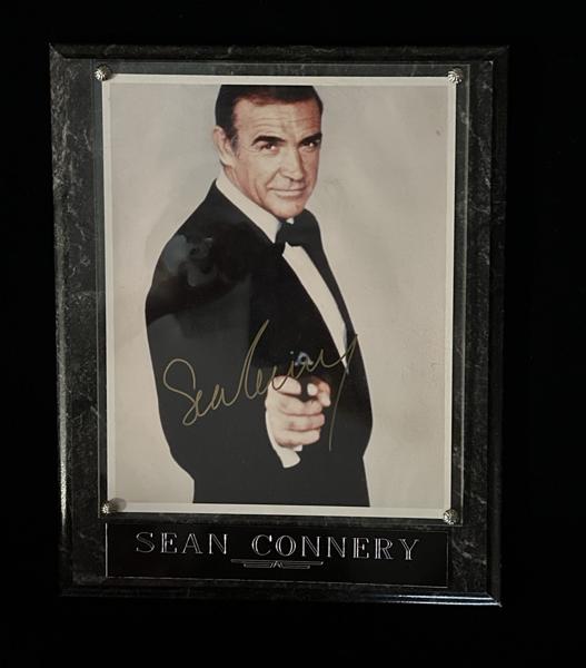 Full color 8” x 10” photograph in a heavy, marble-like frame. Very fine, signed in gold ink by Connery. Iconic photograph of Connery in a tuxedo, pointing a gun.