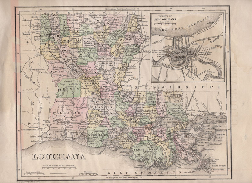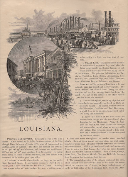 First edition. Quarto. 12 1/4" x 9 3/4" in sewn, printed wrappers. 12 pp. (including covers). Illustrations, map, double columns, footnotes. Page 2 offers a full-page color map of Louisiana showing counties, cities, railroads, etc. Inset at upper right corner is a 3 1/2" x 3 1/2" black and white map showing New Orleans. Offers questions about the map, vocabulary, and much information about Louisiana to include information on the coastline, lakes, climate, various rivers, vegetation, soil, minerals, manufacturers, government, railroad, industries, education, penal institutions, state charities, cities and towns, religion, history, etc. Illustrations show a levee at New Orleans, St. Charles Street in New Orleans, Tulane Hall, Louisiana's Institution for the Deaf and Dumb and the Blind in Baton Rouge, etc. A light old water stain to the top corner of the front cover, a light corner crease to the top edge of the last page and the rear cover along with a few minor nicks to the fore-edges and extremities, else a very good copy.