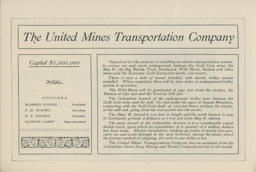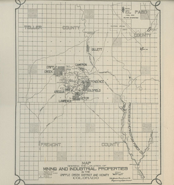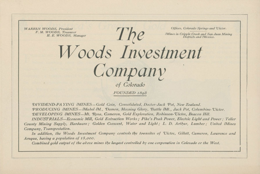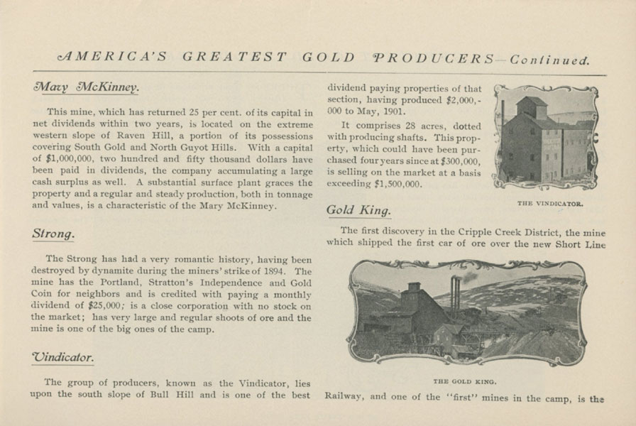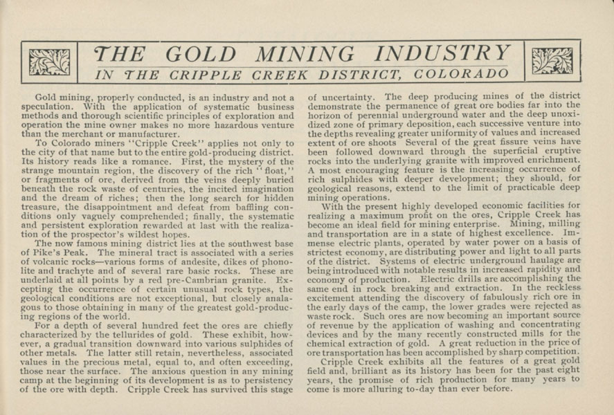 5" x 7 1/2" oblong in color pictorial wrappers. 48 pp., frontispiece, maps, illustrations. Produced for the Pam-American Exposition in Buffalo, 1901. Overview of all mining companies to include The Portland, Stratton's Independence, Elkton, Mary McKinney, Strong, The Vindicator, The Gold King, The Isabella, Gold Coin Mining and Leasing Company, Consolidate Mines Company, Doctor Jack Pot Consolidated Mining Company, New Zealand Consolidated Mining Company, Mabel M. Consolidated Mining Company, Damon Gold Mining Company, Battle Mountain Consolidated Gold Mining Company, the Morning Glory Mining and Leasing Company, Columbine-Victor Deep Mining and Tunnel Company, Mount Rosa Mining, Milling and Land Company, Cameron Mines, Land and Tunnel Company, Cripple Creek Gold Exploration Company, Robinson-Victor Mine, Beacon Hill Mining and Townsite Company, South Gold Coin Mining Company, Montrose Gold Mining Company, Victor Mines and Land Company, E. F. C. Mining and Milling Company, Elsmere Mining and Leasing Company, Economic Gold Extraction Company, the Teller County Mining Supply Company, the L. D. Arthur Lumber Company, Pike's Peak Power Company, etc. Numerous photographs to include the Gold Coin Shaft House, the interior of Gold Coin Mine, properties of the Consolidated Mines Company, the mines of the Doctor Jack Pot Consolidated Mining Company, the New Zealand Consolidated Mining Company, Mabel M. Consolidated Mining Company, the Uinta Tunnel, Victor Colorado, Cameron Colorado, Robinson-Victor Mine, shift workers waiting to go down into the mine, interior views of the barrel room, the roasters, the laboratory, the Teller County Mining Supply Company, the L. D. Arthur Lumber Company, the town of Gillett, the Gold Coin Club, viewpoint from Point Sublime, the Mining Stock Exchange in Colorado Springs, etc. Map Showing the Location of Mining and Industrial Properties in the Cripple Creek District and Vicinity. Geological map of the Cripple Creek district. Overviews of the gold mining industry in the Cripple Creek area, as well as an overview of the mines department. Catalog of mineral specimens that will be on display at the Colorado Exhibit at the Pan American Exposition in Buffalo, 1901. Minimal soiling to wrappers. Very good. A very complete overview of the mining companies.