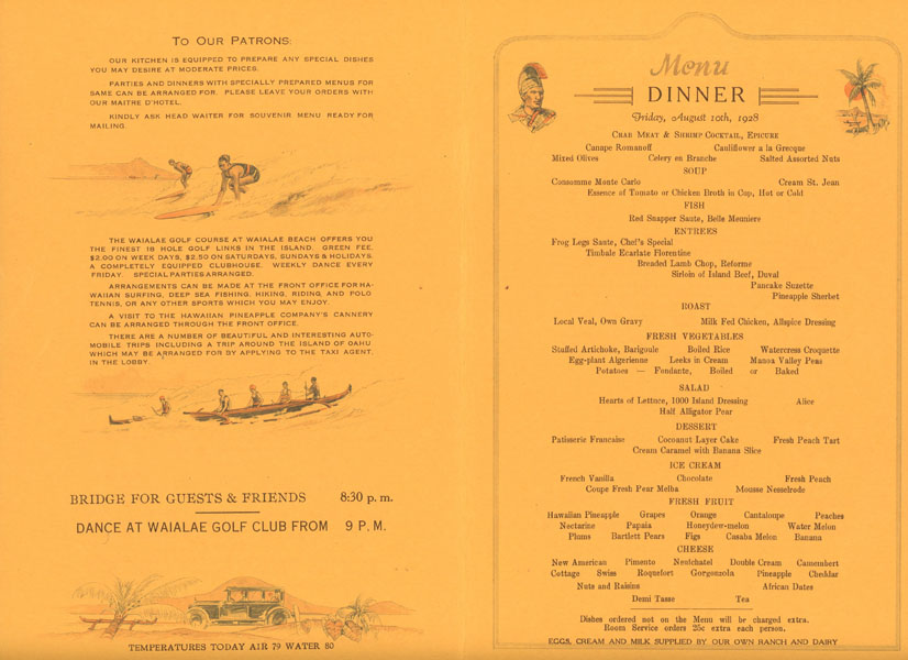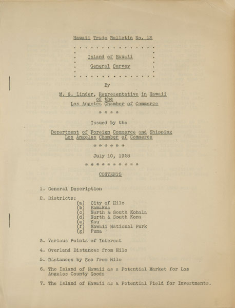 Eight pieces. Piece #1. 6" x 3 1/2" in printed wrappers with green ink lettering. [32] pp. Printed wrappers with green ink lettering. Slightly sunned. Piece #2/3. 7 3/4" x 16" sheet folded to 8 panels with cover art showing a view of the city of Honolulu. Printed in orange and blue and with decorative borders. Light soiling. Piece #4. 11" x 8 1/2" typed, mimeographed and stapled at gutter. Minor age toning, creasing and with one small chip to top corner. Item #5/6. 9 1/4" x 12" folded to 4 panels with striking Art Deco cover art. Light soiling and with creasing to bottom corners and light wear to the extremities. Item #7. 91/4" x 12" folded to 4 panels with bright colorful Art Deco cover art. Light soiling and with light wear to extremities. Item #8. 9" x 12" on orange-tinted paper and folded to 4 panels and with cover artwork showing the dining room of the hotel on the front cover and showing various buildings in Honolulu on the rear cover. All pieces are from the library of Archibald Angus MacDonald, stepson of famed southern California oil man William F. Byrne, as well as oil company and drilling company owner and manager of MacDonald & Burns Oil Producers. A nicely preserved small grouping of printed souvenirs documenting the expansion of Hawaiian tourism in the 1920s, largely sponsored by the Los Angeles Chamber of Commerce, as well as the Los Angeles Steamship Company. By 1928, Hawaii, and the city of Honolulu were seeing approximately 20,000 tourist visitors a year, and the Royal Hawaiian Hotel was also encouraging increased tourism, and use of their beaches on Waikiki, as well as tourist visitors to other islands. The Hawaii Tourist Bureau, successor to the Hawaii Promotion Bureau sponsored a beautification project in Honolulu, encouraged development along Waikiki Beach, development of gold courses, expansion of ocean liner piers, and much more to drive tourism. The Los Angeles Chamber of Commerce and the Los Angeles Steamship company were heavily involved in these efforts, often by recruiting the Who's Who of southern California, including the Bullock's, Eastman's, Jungmeyer's, MacDonald's, and others, such as Hilario Moncado, editor and publisher of Filipino Nation. The Hawaii Trade Bulletin is quite scarce and details the big island of Hawaii, with descriptions of Hilo, Hamakua, Kohala, Kona, Hawaii National Park and Puna, with business listings, map, and mentions of Kona coffee. Shipboard activities onboard the S.S. City of Honolulu included a bridge tournament, shuffleboard, tennis, and masquerade ball. The dinner menu listed nuts, caviar, sardines, Columbia River Salmon, sea food patties, and Hawaiian Salad.