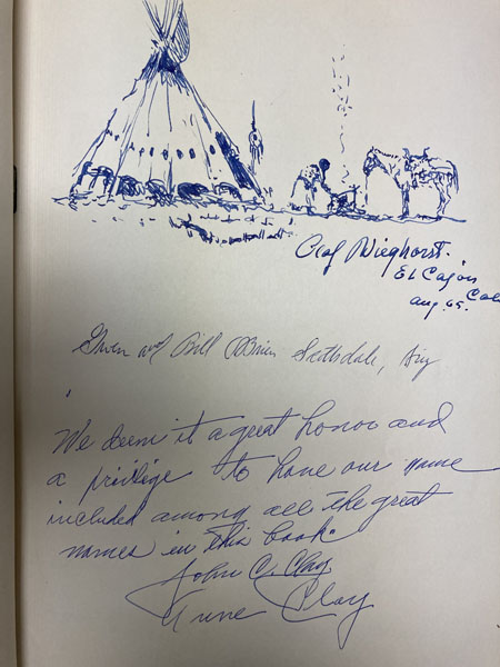 14 1/2" x 9" x 1 1/2" quarter leather and cloth flat opening, sturdy, durabilt ledger, full of great original drawings and signatures. This was originally a ledger Granville Stuart used for recording family births and deaths. It was gifted to Dick Flood of Trailside Galleries by Mrs. Mary Stuart Abbott, who was Mrs. Teddy Blue Abbott. The Granville Stuart Records were removed from the ledger some years ago by Dick Flood of Trailside Galleries who framed them. In 1952 Dick Flood began selling Western art out of his Idaho Falls home. In 1954 he gave the growing business a name ... Trailside Galleries ... and in 1963 he relocated to Jackson Hole, Wyoming. Trailside helped birth the enthusiasm for quality western art at a time when representational art received little respect from critics across the country. Trailside has long been and is widely acknowledged for nurturing and representing only the best, whether it was a legend like the late Harry Jackson or John Clymer, or a fresh new talent just emerging on the art scene. To that end, the gallery’s mission has always remained steadfast: to be a crossroads for both established and new talent. Full of great original drawings and signatures including Olaf Wieghorst, Ace Powell, Ted DeGrazia, Joe Beeler, Gus Shafer, Don Perceval, Harold Hopkinson, Charlie Dye, William Moyers, Wolfgang Pogzeba, Ernest Berke, Stan Lynde, and others. Autographs and inscriptions by Harold Davidson, Fred Renner, Ben Johnson, Rex Arrowsmith, Ed Bohlin, John Glenn, Tom Decker, Michael Kennedy, Frances Humphrey Howard (sister of Hubert H. Humphrey), A.A.R. Rockefeller, and many other artists, collectors and celebrities. Provenance included is a handwritten letter in Gerri Flood's hand regarding the history of the ledger. The ledger has rubbing to the fore-edges and the spine is loosened, but this is a sturdy ledger and is in strong very good condition.