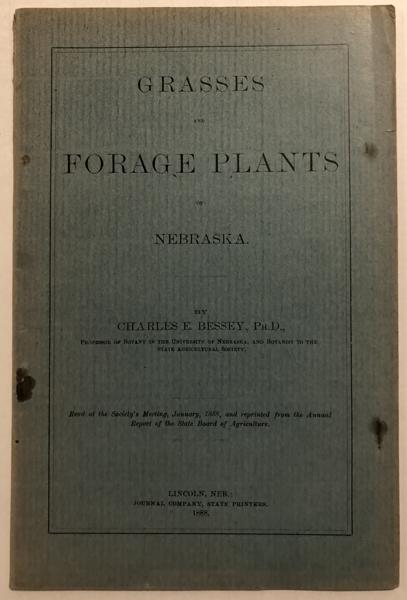First edition. Stiff printed wrappers, 15 pp. + 20 full-page plates. 1 map. With the emergence of cattle grazing as a primary agricultural development of this time period, this report was important to many ranchers and farmers in Nebraska and the surrounding area. Charles Bessey was a noted Professor of Botany who created the first undergraduate botanical laboratory in the United States. In 1884 he became Dean of Agriculture at the University of Nebraska and initiated a tree planting experiment that resulted in the Nebraska National Forest, the first man made national forest in the world. A few dark spots from the staples that bind the report, else a fine copy.
