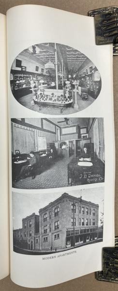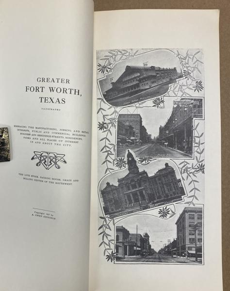First edition. 12" x 6" in colorful pictorial wrappers, printed in shades of pink, green, and brown. [60] pp. A collection of black and white photographs of Fort Worth. Offers photographs of Fort Worth panoramas, railroad stations, colleges and universities, orphanages, municipal buildings, churches, schools, parks, commercial buildings, factories, streets, hospitals, and homes. A wonderful and diverse collection of photos. Light soiling and light wear to extremities along with chipping to spine. Still very good.