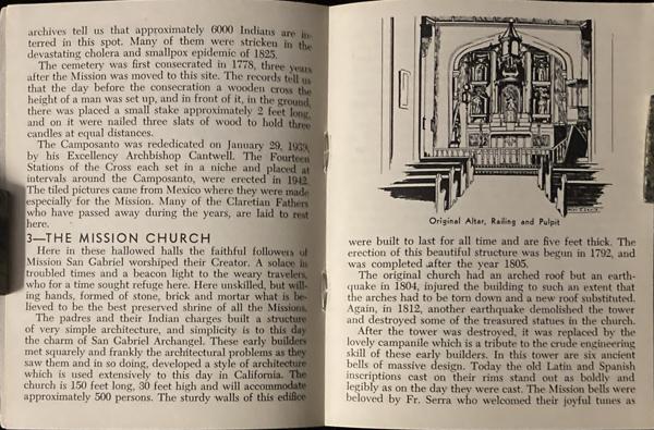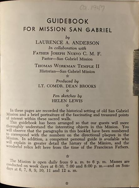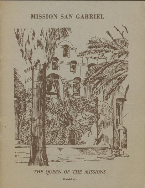 First edition. 5 3/8" x 4 1/4" pictorial wrappers, n. p. (20 pp.), illustrated. Pen sketches by Helen Lewis. Booklet provides the historical setting of old San Gabriel Mission in California and a broad portraiture of the fascinating and treasured points of interest within the sacred walls. Very good copy.