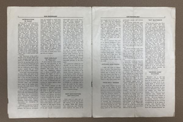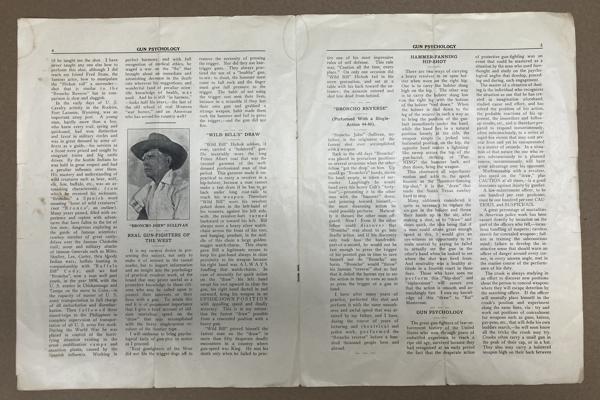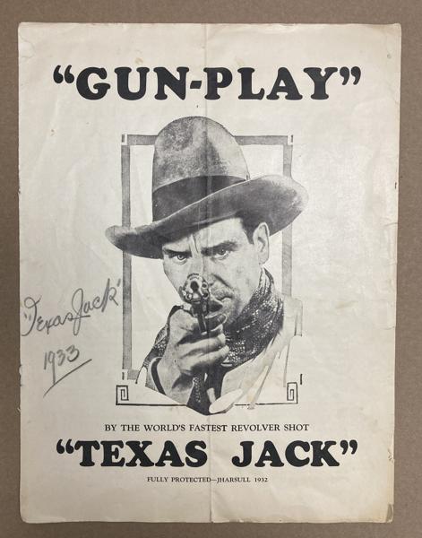 First edition. 9" x 12" pictorial printed wrappers, 8 pp. (including covers), introduction, illustrated, triple columns. "Texas Jack" was known to law enforcement officials throughout the U. S. as Revolver Instructor extraordinary and Psychologist to the American Police. "As such he has the reputation of being the fastest man in the world on the "Draw," "Reverse," "Hip Shot," "Hammer-fanning," etc., and the only living one who, according to Bat Masterson, "his (Sullivan's) speed with a revolver equaled that of 'Wild Bill' (Hickok) in the heyday of Bill's career." Texas Jack learned his craft from an early age under the personal training and instruction of "Bat" Masterson and "Bronco John" Sullivan, his father, and personally knew many of the famous frontiersmen who made history. There is information on "Wild Bill" Hickok, "Bat" Masterson, "Broncho John" Sullivan, Hickok's fast draw, Broncho John's "reverse" draw, Hammer-fanning hip-shot type draw, gun psychology, the horse pistol, gun-handling hints from "Texas Jack." Additionally "Texas Jack" Sullivan is a graduate of Notre Dame, one of Knute Rockne's first athletic disciples, is the author of a number of short stories, holds championships as a cowboy contender at Rodeos and Round-ups, world's fastest revolver shot, and holder of world's long distance and endurance canoe championship, having paddled an eighteen-foot canoe from New York City to Tampico, Mexico, in 1913 under the auspices of the Hudson River Yacht Club; and later in 1923 under auspices of the Cleveland Yacht Club he paddled across treacherous Lake Erie, a distance of 76 miles, in twenty-three hours and fifty-six minutes. Vertical crease at center along with light soiling to cover panels to include 2" x 2" old water spot to top edge of rear panel. Light chipping and wear to edges along with 1" closed tear to top edge of rear panel. Neatly signed and dated by Texas Jack on the front wrapper. Very good copy of a very scarce item.