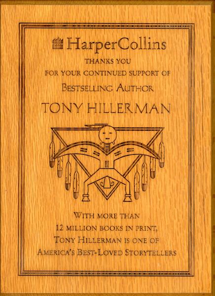 A 9" x 12" wooden plaque engraved to a deserving bookseller for their continued support to sell the books of bestselling author, Tony Hillerman. Attractively done and in fine condition.