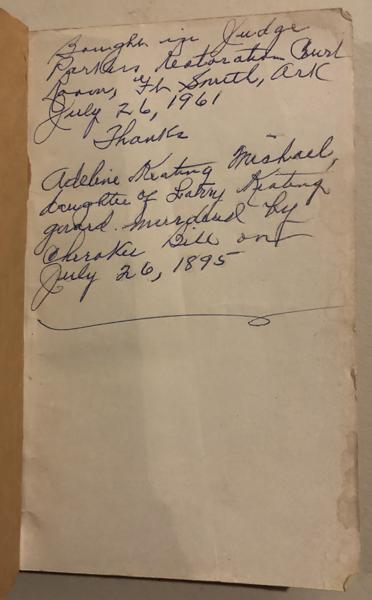 Reprint of rare 1898 first edition. Stiff Pictorial Wrappers. xiii, 303pp. Frontispiece. Several Plates. Descriptive sub-title: "A History of the Great United States Criminal Court at Ft. Smith and of Crimes and Criminals in the Indian Territory and the Trials and Punishment Thereof before his honor United States Judge Isaac C. Parker 'The Terror Of Lawbreakers'... "This outlaw classic describes the career of the famous "hanging judge," Isaac C. Parker of Fort Smith, Arkansas. The author was a lawyer who practiced in Parker's court, and who was intimately familiar with the lawless state of the eastern Indian Territory from the mid-1870s to the 1890s. The Territory had become a refuge for various criminal types on the lam from other jurisdictions, a situation which persisted until its opening to settlement in 1889. Harman describes the criminals and their crimes with gusto."--Bill Reese, Best Of The West 226. Cherokee Bill was a well-known criminal, known for his overwhelming of guards in the jail in Ft. Smith, and killing of one of the guards, for which he was eventually hanged in Ft. Smith. The inscription on the verso of the fronts in this book is noteworthy, and a desirable association: "Bought in Judge Parker's Restoration Court Room, Ft. Smith, Ark. July 26, 1961. Thanks. Adeline Keating Michael, daughter of Larry Keating, guard murdered by Cherokee Bill on July 26, 1895." Some creasing and wear to wrappers, with a few small chips to edges. Text block clean and tight, with tanning to paper. Very good.