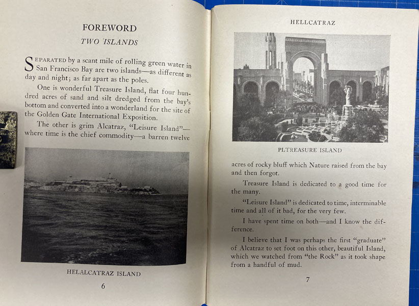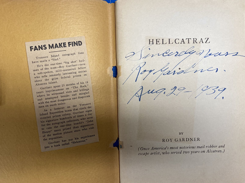 First edition. 8vo. Inscribed by the author. Pictorial wrappers, 109 pp., author's note, foreword, illustrated. The author spent 25 months of his 18 years imprisonment on "The Rock," where he witnessed riots and killings and attempted breaks and mingled with the most dangerous and desperate men of the day. He wrote this little book and sold it as he did his job as a guide on Treasure Island that was converted for the Golden Gate International Exposition. He knew many of the criminals of the day and has much to say about Alvin Karpis, Al Capone, "Machine Gun" Kelly, and others. Six Guns 806 says, "Scarce." "These little books on life in Alcatraz were sold by the author while he was serving as a guide at the Golden Gate Exposition. He was a latter-day train robber." Covers lightly used else a very good copy.