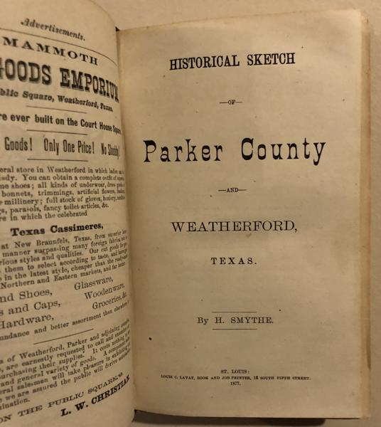 First Edition. 8vo. Original Brown Cloth (i-xvi Advertisements), i-viii, viii blank, (1)-476p., 19.3 x 12.5 cm., Purple Endpapers front and back. Preface. Tables. Directory. Index. All advertisements are present and intact. This rare county history contains information regarding early settlers, outlaws and lawmen, range history and literature, prominent citizens, Indian problems, etc. Accounts of Indian raids scattered throughout. General Sherman's response to the Kiowa attack on the Warren Wagon Train is of exceptional importance. "Contains an account of General Sherman's tour of inspection during the months of April, May and June, 1871, taken from the manuscript journal kept by Inspector-General R. B. Marcy, with a full account of the Indian chiefs Big Tree and Satanta."-Everett D. Graff, 3873. "The first procurable history of a Texas county. Material on the cattle trade is scattered throughout the work."--Six Score 100. "Rare"--Adam's Herd 2103. Sunning to spine, modest wear to edges, corners, and spine ends. Chipping and repair to bottom edge of spine. Water damage to bottom fourth of rear panel and damp stain to bottom fore-corner of last few pages. Very good. A rare work, even more rare in original cloth! Protected in a clamshell box with title, author, and year of publication in gilt on leather label on spine.