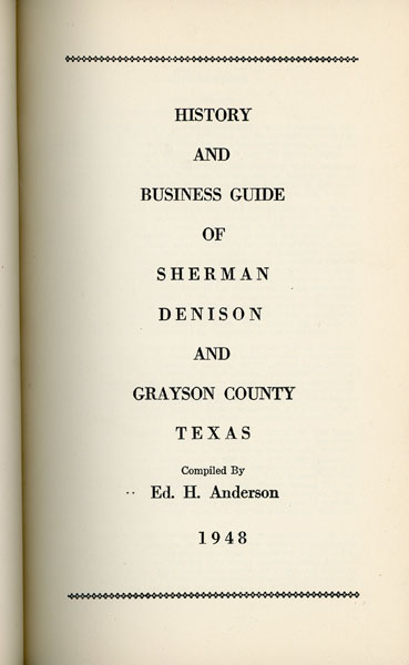 Revised and expanded version of the original 1940 first edition. Original cream-colored pictorial stiff wrappers, n. p. [84 pp.], advertisements. Designed to promote Grayson County and its two principal cities of Sherman and Denison, it gives an overview of the area, its history, and recreational opportunities. There is information on Sherman and Denison with an overview of their founding, their economy, the business environment, education, population, civic organizations, etc. Has a section on getting a Texas Driver’s license and a warning on the dangers of driving while under the influence of alcohol and drugs. Scarce with OCLC locating eight copies. Covers lightly used else a very good copy.