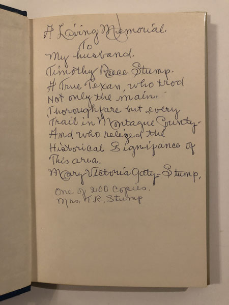 First Edition. Blue Cloth. Limited to 200 copies. 98pp. Compiled and Illustrated by the author's wife, Mary Victoria Gary Stump. A detailed record of the many Indian raids and hostile incidents experienced by the early settlers of Montague County. The author's grandfather, Reece Bowen Stump, was a Texas Ranger, and shared many accounts with his grandson, developing the author's strong interest in the early history of the area. These accounts were originally written by the author circa 1940. A lengthy Memorial to the author is handwritten and signed by his wife, on the front free-endpaper; also stating the limitation to 200 copies. A fine, bright copy in dust jacket.