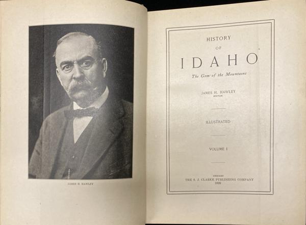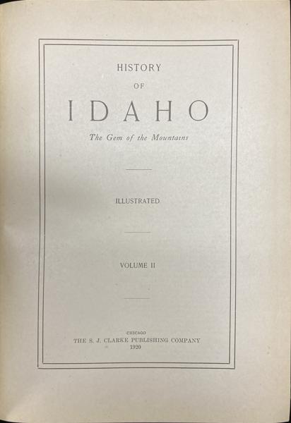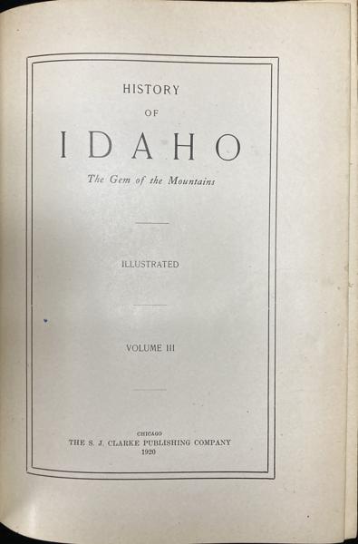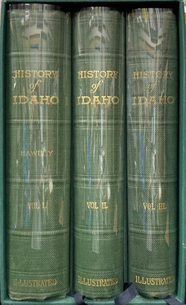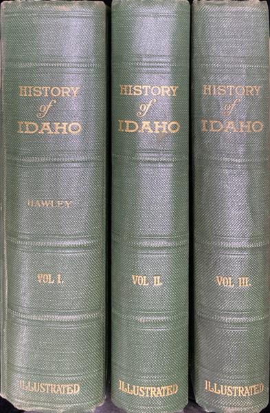 First edition. Thick quarto. VOLUME I: Green cloth, decorated endpapers, 895 pp., frontis. [portrait of the editor], all edges marbled, foreword, illustrated, plates, portraits, index. This volume details the ante-territorial, territorial, and the state of Idaho history. Much on Indians, Indian treaties, explorers and exploration, fur traders, settlement of the state, discovery of gold, pioneer days, admission to the Union, penal institutions, education, newspapers, early transportation, Idaho's railroads, agriculture, mining and manufacturing, Indian troubles, trading and military posts, major cities, towns, and villages, religion, fraternal and civic societies. VOLUME II: Green cloth, decorated endpapers, 1008 pp., all edges marbled, illustrated, portraits. A biographical album with biographical sketches of pioneers and prominent citizens of Idaho along with portraits of many of the citizens. VOLUME III: Green cloth, decorated endpapers, 908 pp., frontis. [portrait], all edges marbled, illustrated, portraits, index. Continued biographical sketches of pioneer and prominent citizens of Idaho. Six Guns 949 says "Scarce." "Has a chapter on lawlessness and the professional bad man and contains material on the vigilantes, Henry Plummer, Cherokee Bob, Boone Helm, Farmer Peel, George Ives, Bob Zachary, and others." A light bit of professional, cosmetic restoration to the spine ends and corners, else a near fine set, housed in a cloth slipcase with leather label on spine and titles stamped in gold.