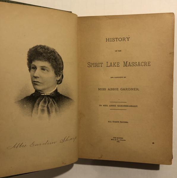 First Edition. First Issue. Green decorative-cloth, with Title and Author in gilt on spine. Frontis Portrait of Abbie Gardner-Sharp. Preface. Appendix. 312pp. Over a 5 day period in March, 1857, fifteen Santee Sioux Indians of the Wahpekute band, led by the renegade chief Ink-pa-du-tah, attacked the homes of several settlers in northwestern Iowa, on the shores of Spirit and Okoboji lakes. They brutally killed 35-40 settlers and carried away 4 young women into captivity. Only 13 years old, Abigail Gardner was the youngest of the captives. She witnessed the killing of her family and endured 3 months of captivity before being ransomed. Her firsthand account of this tragedy is a classic. Some light rubbing to edges. Small tape-repair to upper fore-corner of one page, not affecting text. Small scar from erasure of previous owners name on front free endpaper. Very good+. While the Second Issue of this classic book is quite scarce, this First Issue is truly rare, and the first copy that we've offered.