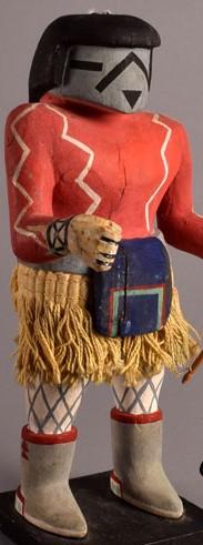 This is a rarely-carved Hopi Pueblo Katsina, representing an animal herder. It does represent a katsina, however. The skirt was made from bungling bands of string and wrapping them at the top, a very laborious process. There is a crack in the wood on the front from the chest down to the loin cloth. The left arm has been repaired and painted. The rarity of the carving helps offset the condition problems. This Hopi Lalay'hoya, Animal Herder Rare Katsina Doll Carving is mounted on a square black wood platform of the style used by the Fred Harvey Company on many of its katsina dolls. There are no other identifying markings to indicate a Fred Harvey provenance. My thoughts are that he is a legitimately Hopi carved doll that has had some repairs. Regarding the Animal Herder ... he is in the condition he was in when he arrived here. He most likely had eagle feathers attached to his head originally. Those would have been removed at some point, as it is illegal to have them. Sometimes, people will attach turkey feathers to restore the original look of the doll. I cannot say with certainty what was in his right hand, but it may have been a rattle, as those are also common for pieces like this. It is (unfortunately) very common for older kachinas to have lost and gained some feathers, a rattle, or even a limb over the years. -- Michael Marchant, Adobe Gallery 4/30/21.