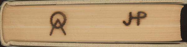First edition. 8vo. Tan cloth, titles and decorations on the front cover and spine stamped in brown, brand decorated front and rear endpapers, viii [4], 242 pp., preface, illustrated with brands. names of brands. Inked presentation Inscription, SIGNED by both authors on the half title page and with their brands burned into the bottom page edges. List of Brand Names at rear. An excellent book on cattle brands with a long chapter on rustlers. "The authors tell many a tale of symbols that betray a tender story stamped with fire on thousands of bawling steers." Fine bright copy with the uncommon brand marks of the authors. stamped into the bottom page edges, in a bright, fresh, clipped dust jacket (retaining the original $2.50 price mark) with light wear to the spine ends. An exceptional copy of a scarce book housed in a protective cardboard slipcase.