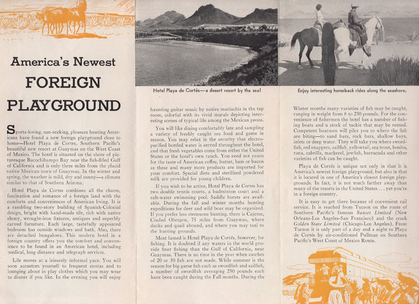First edition. 8vo. 9" x 4" pictorial wrappers, unfolds to 18" x 12" sheet of twelve 9" x 4" panels, illustrated from photographs, map. This a brochure to promote the Southern Pacific Railroad Company's Hotel Playa de Cortes, a desert resort by the sea, built in 1935. The hotel is located at Guaymas on the West Coast of Mexico, on the shore of picturesque Bacochibampo Bay near the Gulf of California. There's plenty of recreation including riding, swimming, golf, tennis, fishing, sailing, hunting, etc. A map of the West Coast of Mexico route is provided by the Southern Pacific. A very good copy of an uncommon brochure.