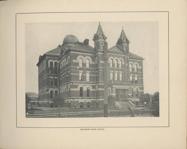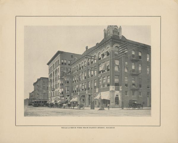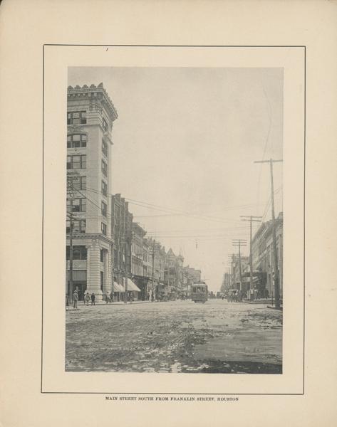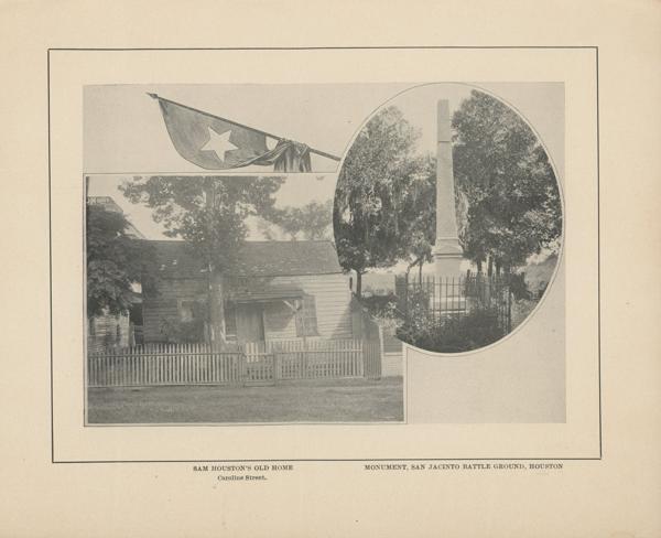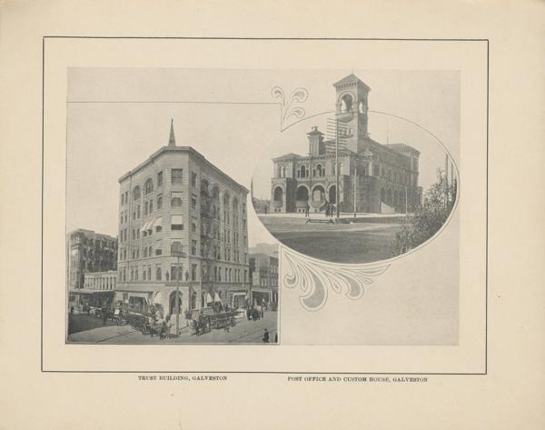 First edition. 8" x 10" in green wrappers with title in gold lettering. [32] pp. Illustrations. Brief information bout Houston and Galveston followed by 31 pages of black and white photographs. Includes views and buildings in Galveston and Houston. The booklet includes Houston images of Commerce Street; Texas Avenue west from Fannin Street; Main Street south from Franklin Street; City Hall and Market House; Grand Central Passenger Station; Houston High School; the Carnegie Library; various residences, churches and hotels; etc. Scenes of Galveston include wharf scenes; Central Park; Market Street; Ball High School; the Court House; the Cotton Exchange Building; Texas Heroes' Monument; Garten Verein; various churches, buildings and residences; etc. Pages lightly soiled, light fading and soiling to wrappers along with light vertical fold at center and with light wear to the extremities. Very good.