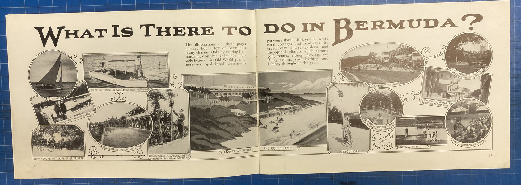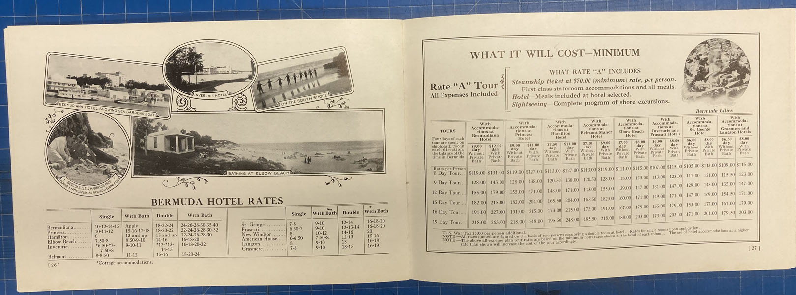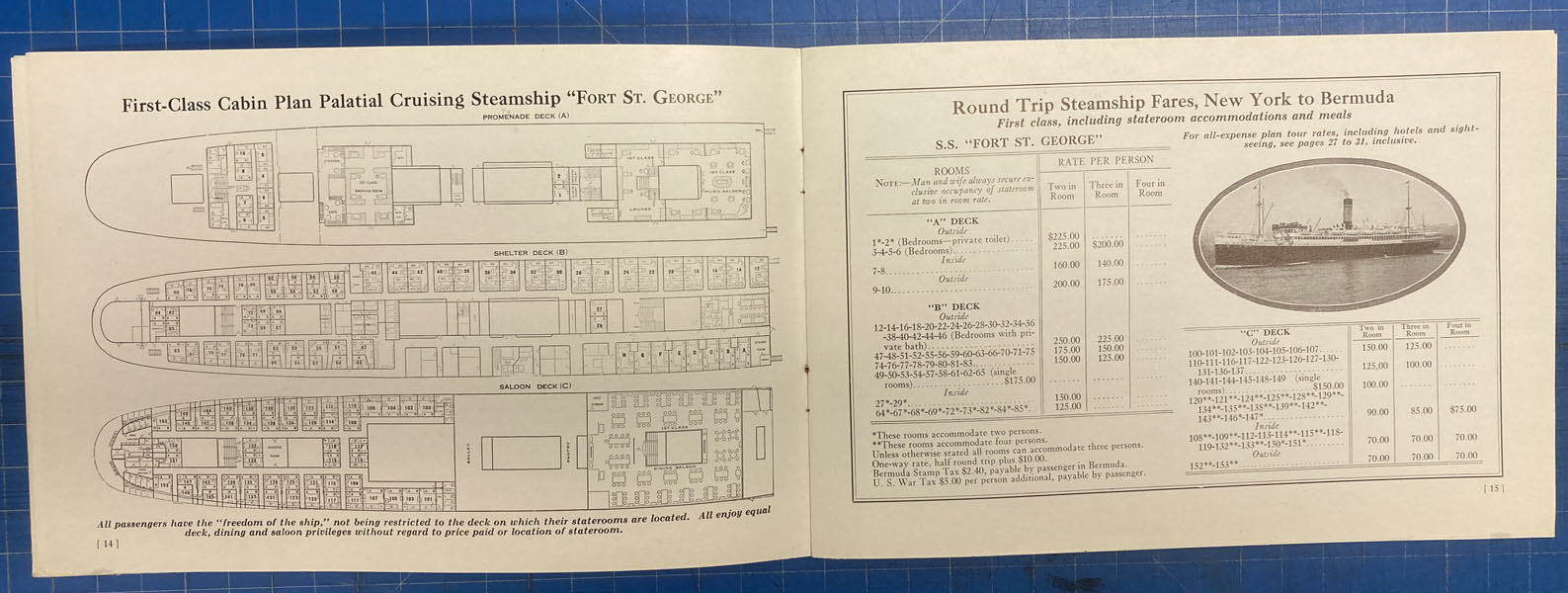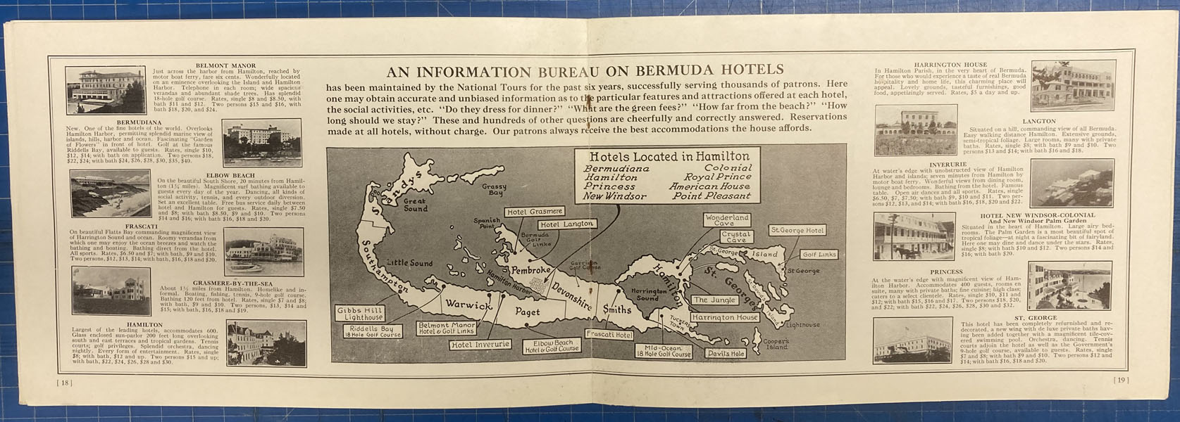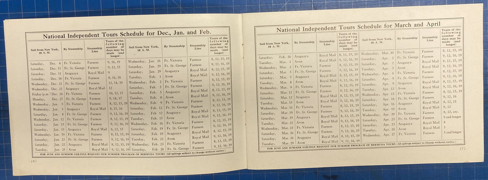 6" x 9" in colorful pictorial wrappers. 36pp. Illustrations. Itinerary. Schedules. Rates. Deck plans. Testimonials. Photographs and information about sightseeing in Bermuda, things to do while visiting, hotels and their rates with and without bath (minimum-rated hotels through preferred hotels). Photographs of various ships to include the S.S. Fort Victoria and S.S. Ft. George, the R.M.S.P. "Araguaya" and "Avon," etc. Schedules for National Independent Tours, Furness Bermuda Lines, and Royal Mail Steam Packet Company. Round-trip steamship fares from New York to Bermuda aboard various steamships. Deck plans for various cruising ships. Charts showing "What it will Cost" when traveling via the least expensive tour vs. the most expensive tour. Information on what to tip on the ship and while in Bermuda; what kind of money to use in Bermuda; what kinds of clothes to wear on the ship; how to pack for Bermuda, etc. Light vertical crease to front wrapper and with light wear. Light soiling to bottom corners of first few pages. Very good.