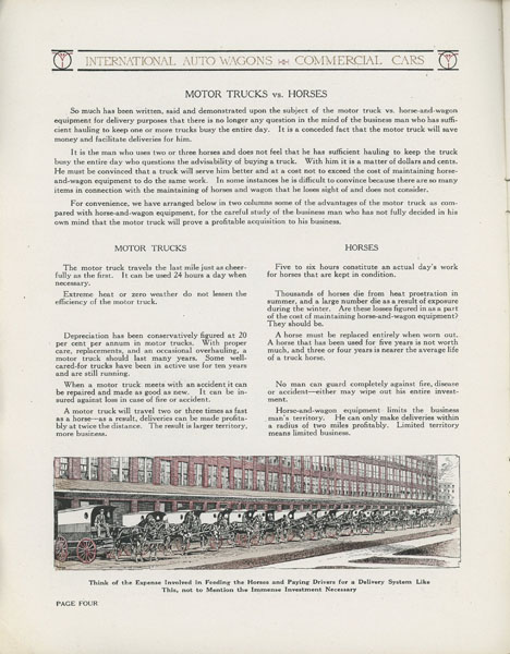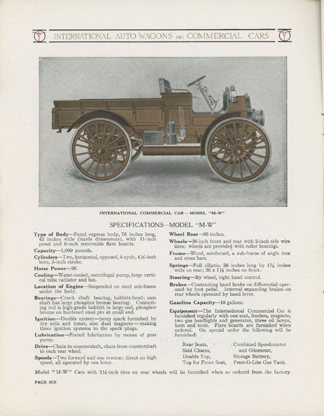 First edition. 9 3/4" x 7 3/4" in turquoise pictorial wrappers showing an illustration of an auto wagon. Title and illustration are printed in silver. 24pp. Illustrations. Specifications. The International Service Car, “is manufactured in quantities to insure the best possible construction at minimum cost. It is not a pleasure car, and does not compete with pleasure cars, neither is it a pleasure car made over to sell as a business wagon. It is strictly a commercial car whose size, power, shape, transmission, tires, road clearance, construction, price - all are the result of years of experience in building a car that should prove most satisfactory for light hauling and quick deliveries in the hands of average drivers.” Section on Motor Trucks vs. Horses .... “It is the man who uses two or three horses and does not feel that he has sufficient hauling to keep the truck busy the entire day who questions the advisability of buying a truck. With him it is a matter of dollars and cents. He msut be convinced that a truck will serve him better and at a cost not to exceed the cost of maintaining horse-and-wagon equipment to do the same work.” It is with this in mind that there is the section comparing the use of motor trucks to horses. Illustrations and specifications of several vehicles to include Models “M-W,” “M-A,” “A-A” and “A-W.” Illustrations and specs are followed by information on the vehicle's design, high-grade steel crank shafts and connecting rods, an oiling system without adjustments, a simple and effective clutch, the double-system of ignition, spark plugs and the carburetor being readily accessible, its well constructed body, its one lever control, the ease of operation, etc. Final pages offer illustrations of various special body types. At center is a two-page illustration of the International Commercial Car chassis. Chips to corners of front and rear panels, scraping to spine along with 2" split to foot of spine and scotch tape residue as well as with light creasing to bottom corners of text. Very good.