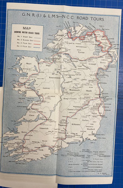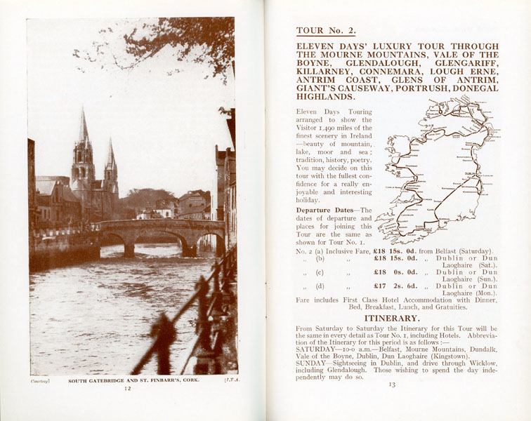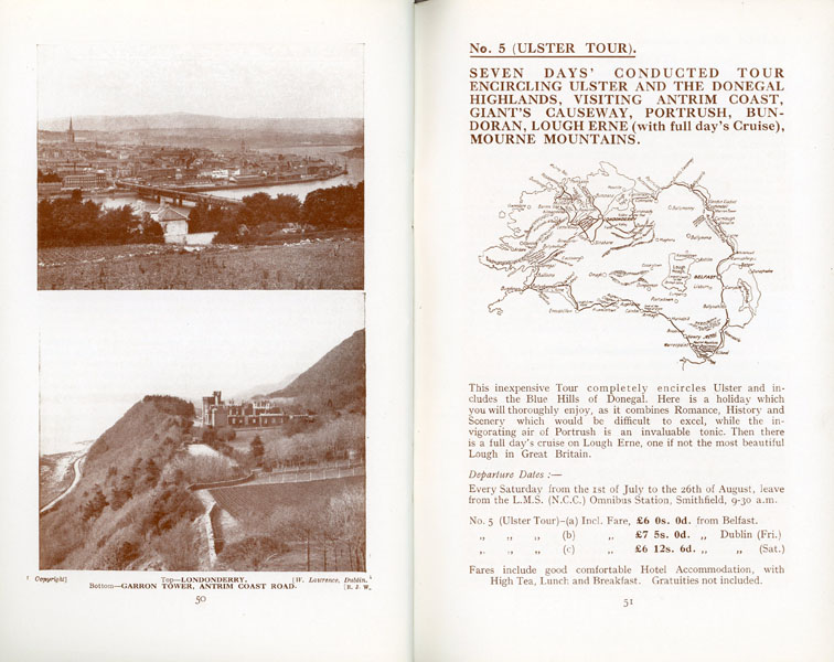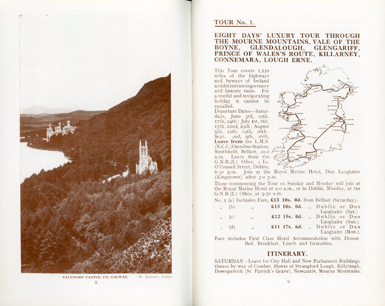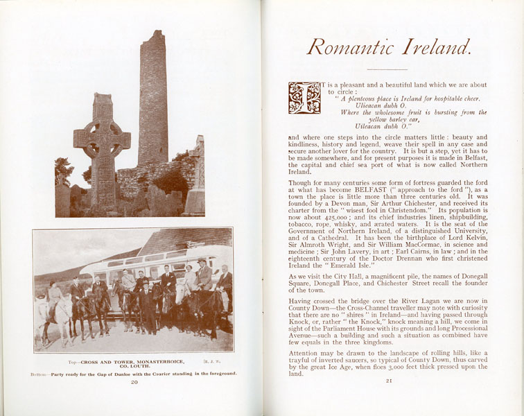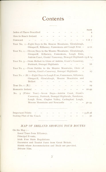 First edition. 8vo. Color pictorial wrappers, 56 pp., foreword, illustrated mostly from photographs, maps. Folding map of Ireland showing tour routes at rear; illustrations throughout. Includes Table of Contents and Index of Places Described. The official brochure for extended tours throughout Ireland, 1933. A charming and informative brochure providing several tour itineraries and pricing and with important notes applying to various tours. History and information about "Romantic Ireland," followed by information and pricing for the 7-day Ulster Tour. Previous owner's name on upper front wrapper along with minimal light soiling and minimal wear to the extremities. Very good.