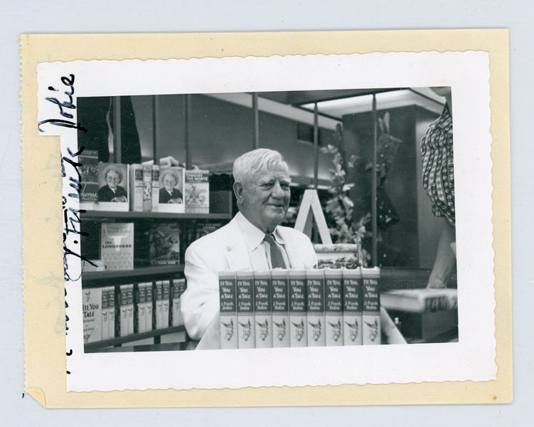 [13 cm x 10 cm] / [5" x 4"] Manuscript letter three pages, presumably to someone at the Texas Folklore Society. Includes a black/white photograph [9 cm x 11 cm] / [3.5" x 4.5"] of Dobie at a book signing in a white suit. and with copies of his book "I'll Tell You A Tale" in front of him and he has signed the photograph in the left margin. The three-page letter reads: "Friday Noon [Nov. 17- '39] Dear Phil, I came an idea about Texas Folk Lore Society. The books should be in more schools. We can let schools have sets at $25.00 each. I wonder if you would be interested in letting a dozen or so men scattered around to place that many sets in schools. The school libraries always seem to be short of funds for buying books. It would be a nice gesture for a man or business to place a set of the books in his town's school library. Well, good wishes - Frank Dobie." Fine condition.