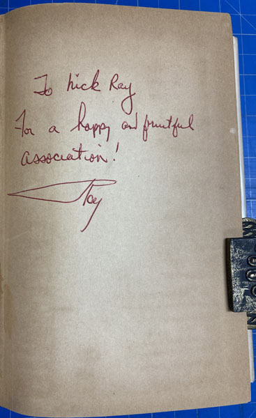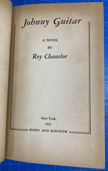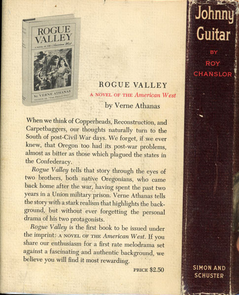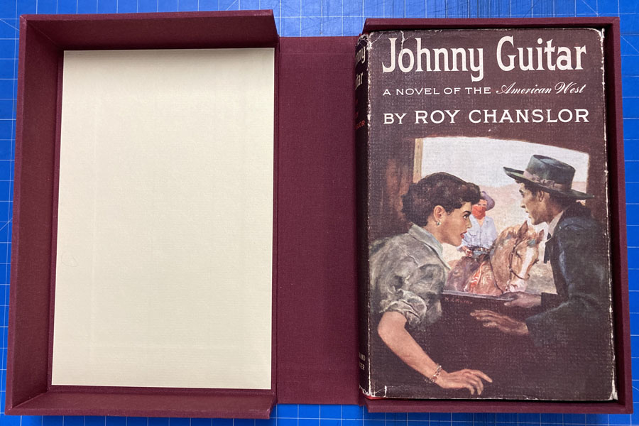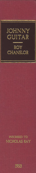 First edition. 8vo. Association copy, Inscribed on the front free fly leaf by Roy Chanslor to film director Nicholas Ray : "To Nick Ray / For a very happy and fruitful association! / Roy." Two-tone paper over boards, titles stamped in gilt on the front cover and spine, [6], 242 pp. The inscription refers to Ray's film version of Chanslor's book, one of the strangest and most important Westerns ever filmed and a critical high spot for Joan Crawford (to whom the book is dedicated). On the outskirts of town, the hard-nosed Vienna owns a saloon frequented by the undesirables of the region, including Dancing Kid and his gang. Another patron of Vienna's establishment is Johnny Guitar, a former gunslinger and her lover. When a heist is pulled in town that results in a man's death, Emma Small, Vienna's rival, rallies the townsfolk to take revenge on Vienna's saloon ... even without proof of her wrongdoing. Basis for the groundbreaking 1954 Western directed by Nicholas Ray and starring Joan Crawford, Mercedes McCambridge, and Sterling Hayden. Page edges uniformly tanned else a very good copy in a bright dust jacket with light wear to the spine ends, corners, with a few tiny nicks and closed tears to the extremities. Extremely scarce in any condition. Housed in a cloth clamshell case with leather spine labels and titles stamped in gilt. The best association imaginable between this key author of post-traditional Western fiction and the film director who famously brought that author's sensibilities into a bold new visual context.