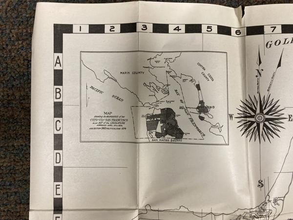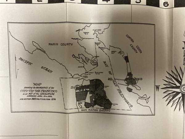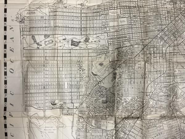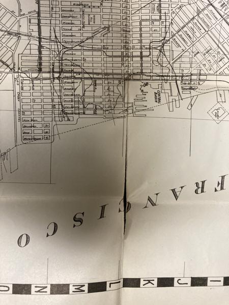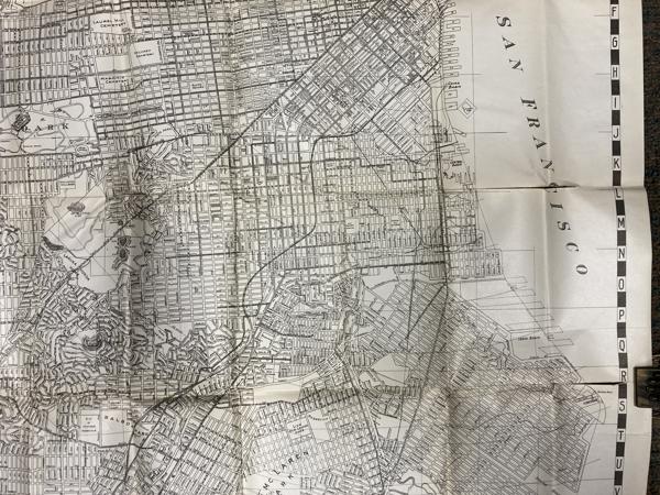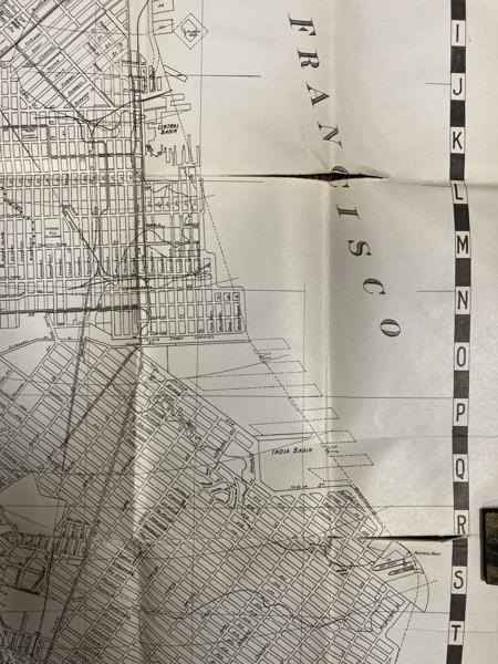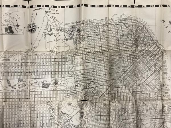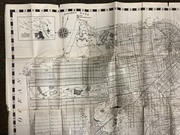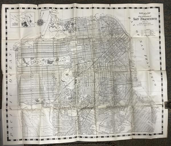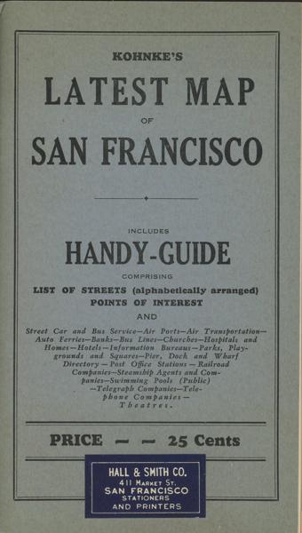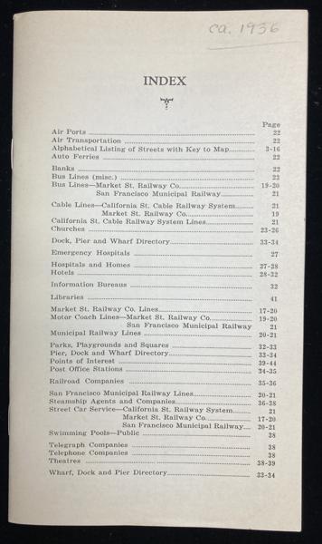 First edition. 7 1/8" x 4 1/8" stiff printed wrappers, 44 pp. plus 4 pp. for memorandum, map, index. Includes a handy guide comprising list of streets (alphabetically arranged), points of interest and street car and bus service, airports, air transportation, auto ferries, banks, bus lines, churches, hospitals, etc., etc. Also included is a 26 1/2" x 32" map titled "Map of the City and County of San Francisco." The map is a black-and-white print, detailed with various city planning elements. It includes streets, city blocks, municipal railways, bus lines, public buildings, landmarks, and parks. Inset map showing boundaries of the city and county of San Francisco.
