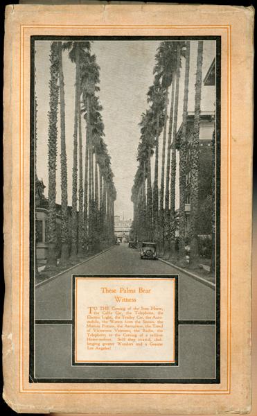 9" x 5.5" printed wrappers. 208 pages, with additional text on insides of front and rear covers, illustrations, portraits. Includes much information about the history of Los Angeles, beginning with its founding and adoption as a civic pueblo by Felipe de Neve. Information included on all aspects of the city to include history of the earliest pioneers, slavery, the Civil War, the city’s growth, Abbot Kinney, the boom of the eighties, WWI, the construction of the coliseum for athletic events, philanthropists, oil wells, railroads, Roosevelt, Hollywood, history of the Security Bank, etc. Profusely illustrated with photographs of the city’s history to include those of early pioneers, Presidents of the L.A. Chamber of Commerce, mayors, buildings, athletic arenas, parades, natural history, trains, automobiles, men and women who impacted Los Angles, etc. A very informative booklet. Light wear to the over-sized cover extremities. that have been professionally restored. Overall a very good tight copy.