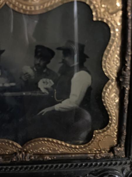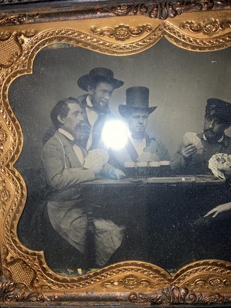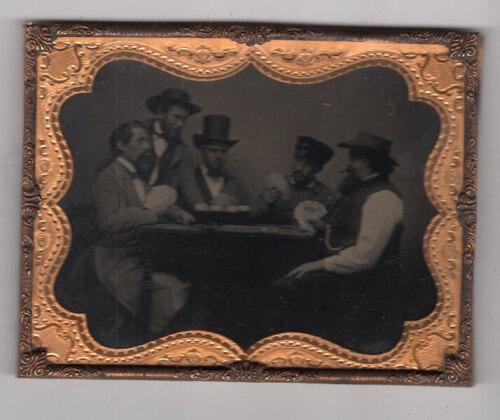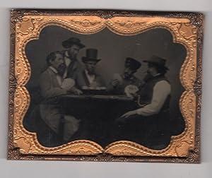 Half Plate, 4 1/8" x 5 1/4" image in a 6 3/4" x 8" frame. The photographer is unidentified. The original frame with a brass mat. Image is of four men seated at a table, playing cards, with a fifth man standing over the table and looking down on the players. An ambrotype is an early type of photographic reproduction by essentially producing a positive picture by backing a glass negative with black paper or paint. A classic image, attractively presented in the original frame in near fine condition. Provenance: Robert G. McCubbin Collection.