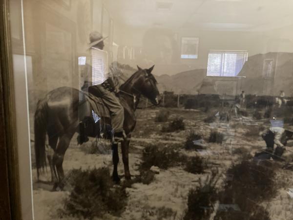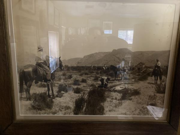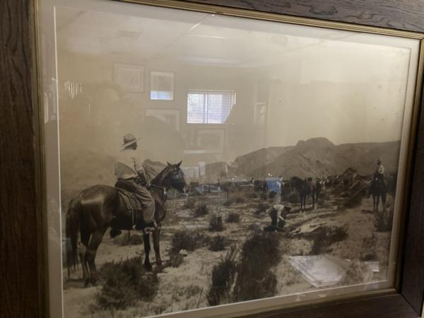 The size of the photograph is approximately 29 1/2" width x 19 1/4" height; matted and framed it is 37" wirth x 27" height. The photograph is signed "Ramsey, Los Angeles." The scene depicts in the foreground two mounted cowboys that have tethered a calf while another cowboy is branding it. In the background are two more mounted cowboys, cattle a ranch house, a few out-buildings, and mountains. This photograph captures an important activity of cattle ranchers. H. H. Ramsey, whose full name is Harry H. Ramsey, was a photographer known for his images of cowboy life and the American West during the late 19th and early 20th centuries. Operating primarily in the southwestern United States, particularly in Texas, Ramsey's work provides a vivid portrayal of cowboy culture, ranch life, and the expansive landscapes of the region. Ramsey's photographs capture various aspects of cowboy life including cattle drives, rodeos, and the everyday activities of ranchers. His images are valued for their authentic and detailed depiction of the era, contributing to the historical understanding of cowboy culture and the American frontier. Many of his photographs are preserved in historical archives and collections dedicated to the American West. A fine presentation with the photograph displaying fine contrasts.